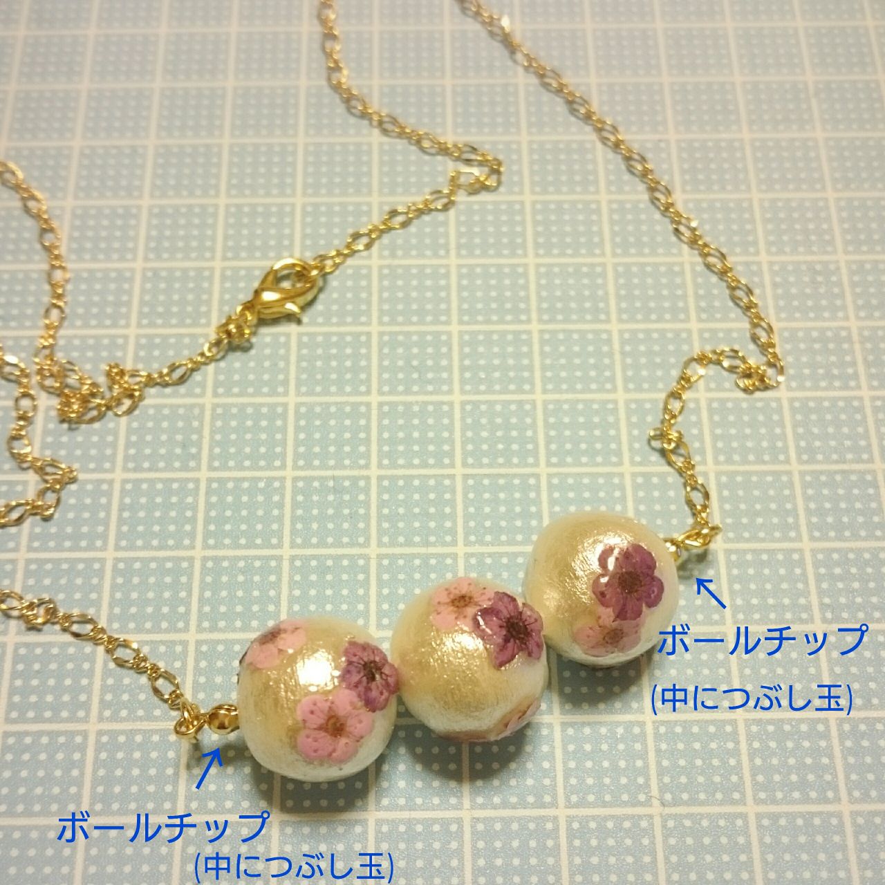 ③コットンパールにテグスを通して、ボールチップを取り付けて、チェーンに接続します。