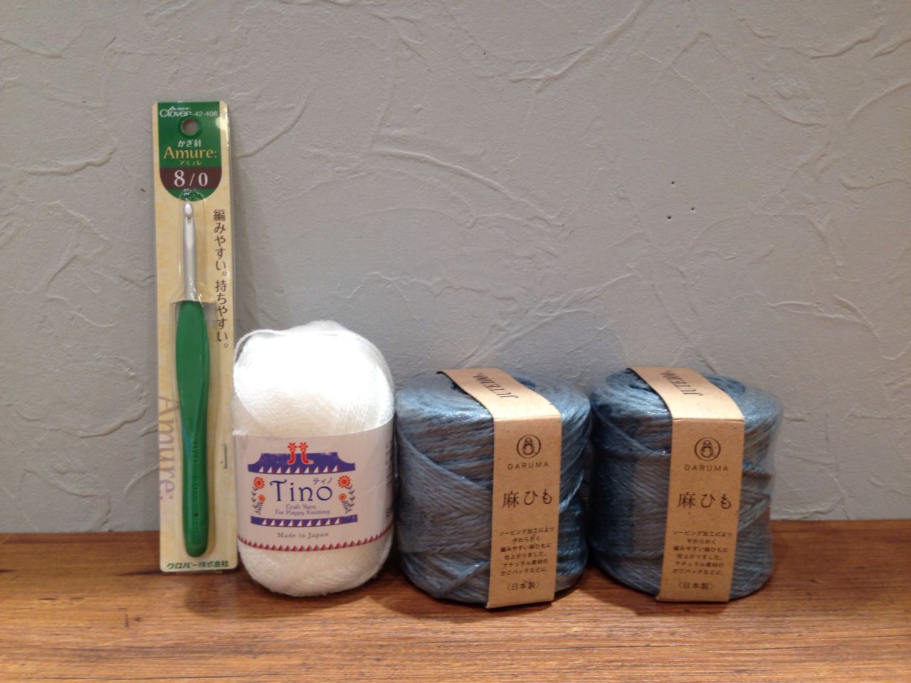 麻ひもだけでもかわいいのですが、今回はハマナカのアクリル糸ティノと引き揃えて編んでみました。