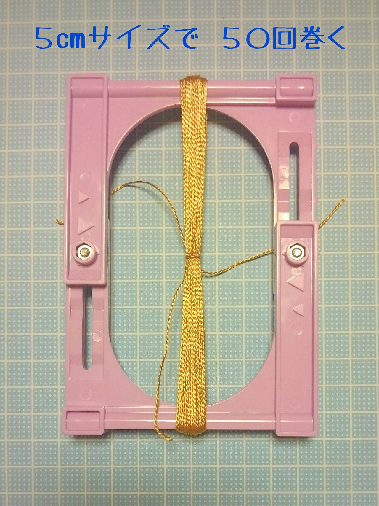 ①タッセルメーカー 5cmサイズに糸を50回巻いて、タッセルを作ります。