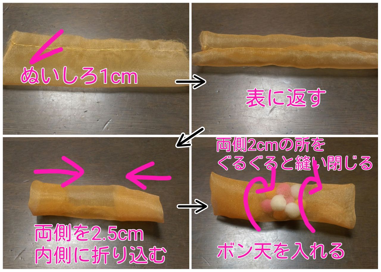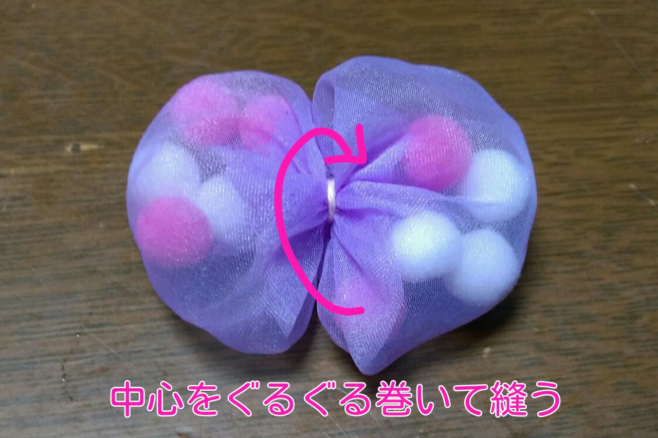 ②ボン天を各色2~3個入れ、写真のように縫い閉じる。