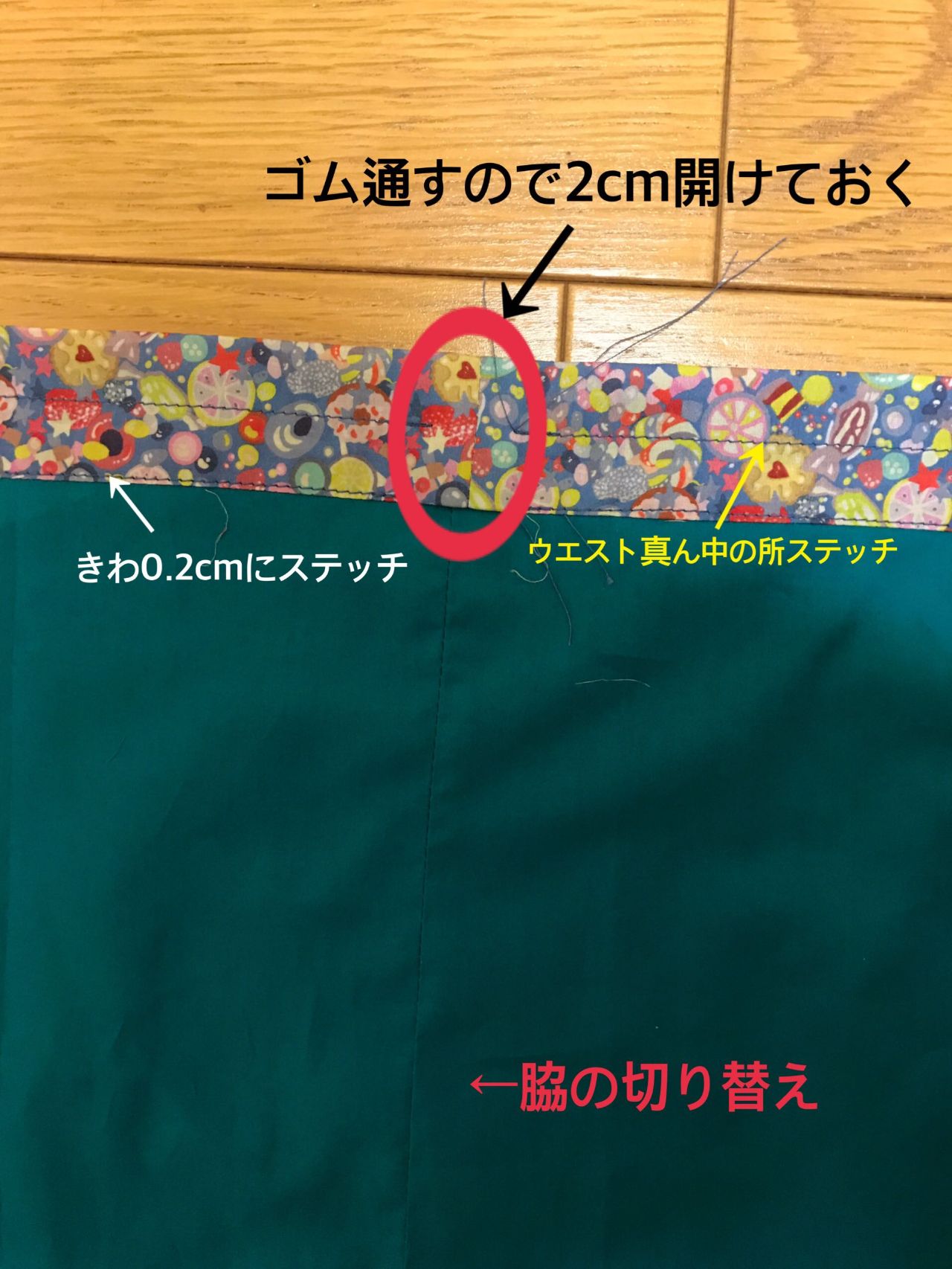 ⑻裏地を包むようにウエスト部分⑺で折ったウエストの縫い代にステッチをかけてゴム通し口を作る。