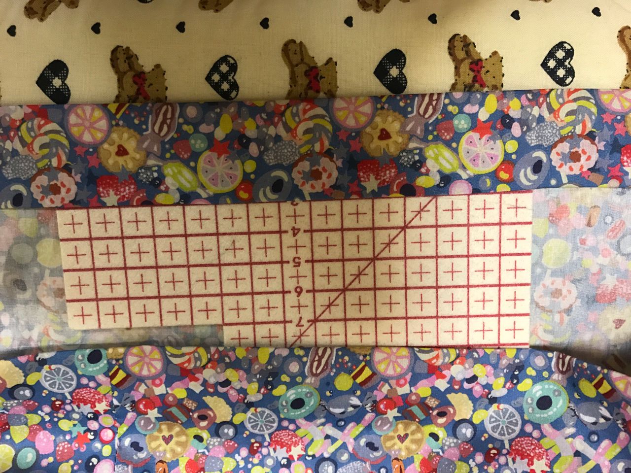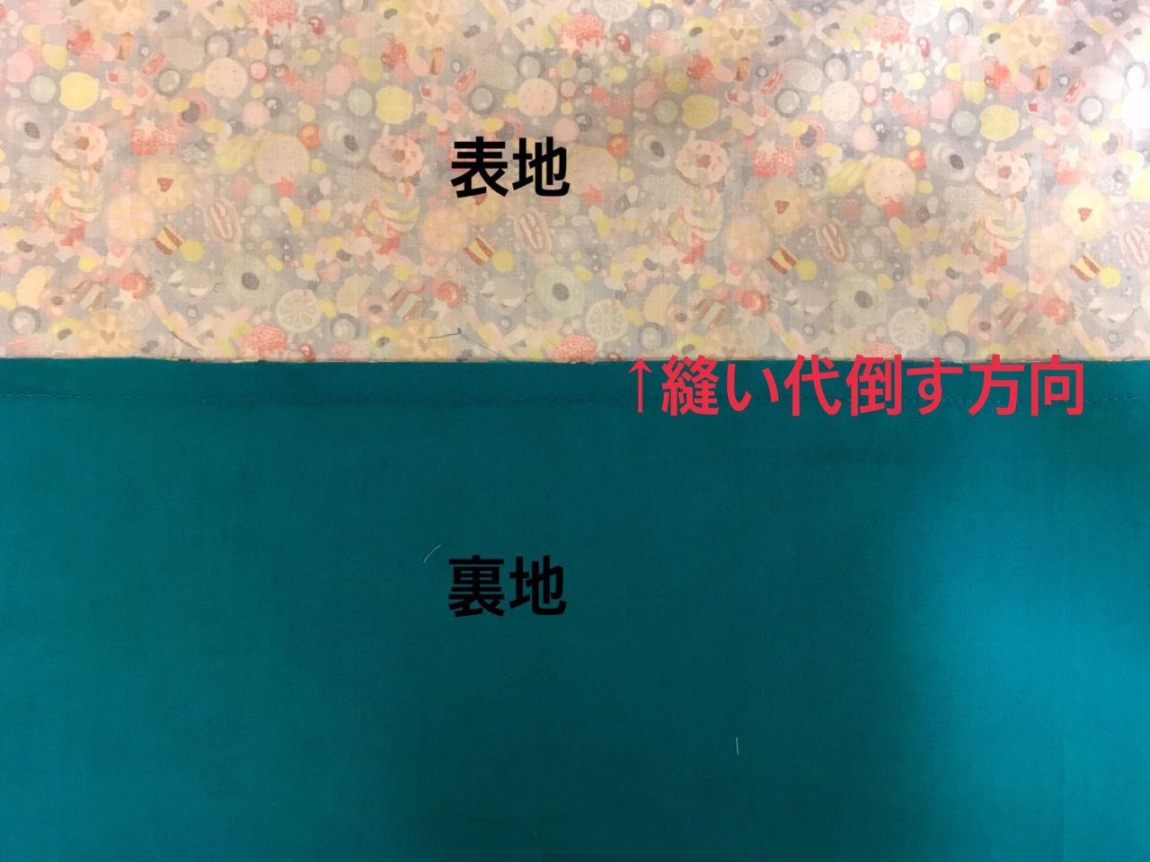 ⑶⑵で縫った縫い代を表地側にアイロンで倒します。