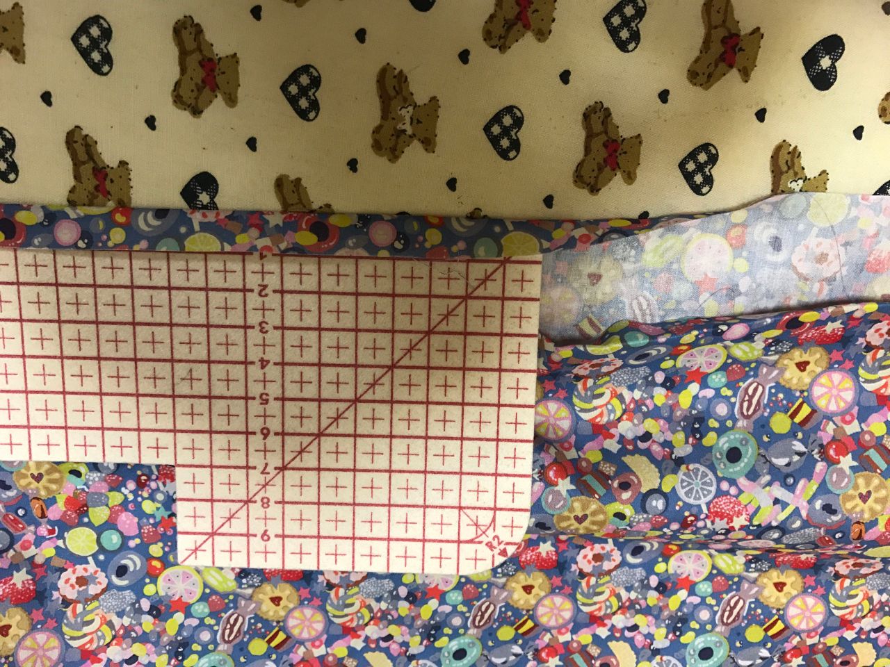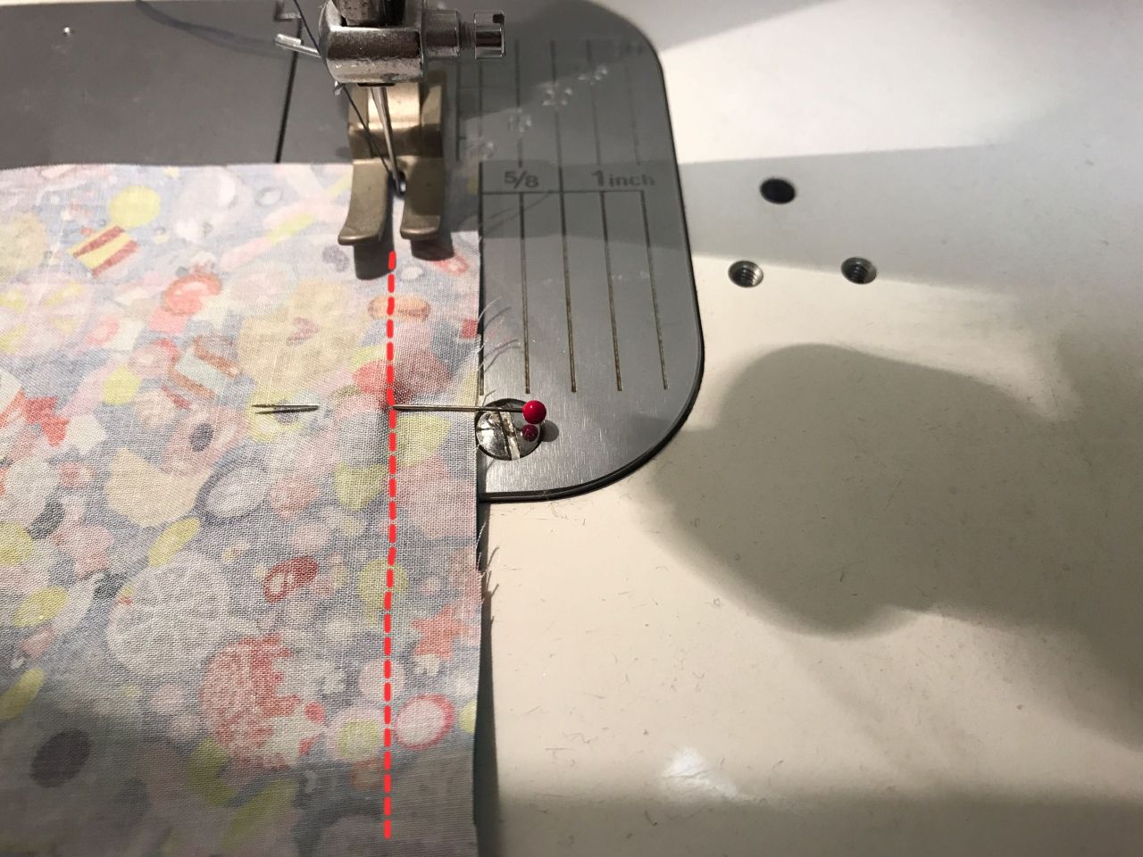⑷縦半分に折って脇を1cmで縫い合わせます。