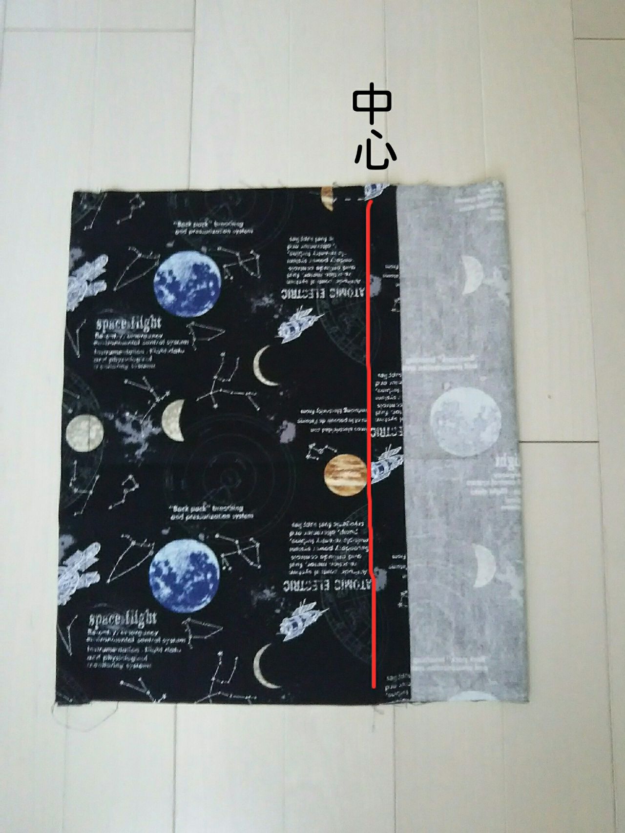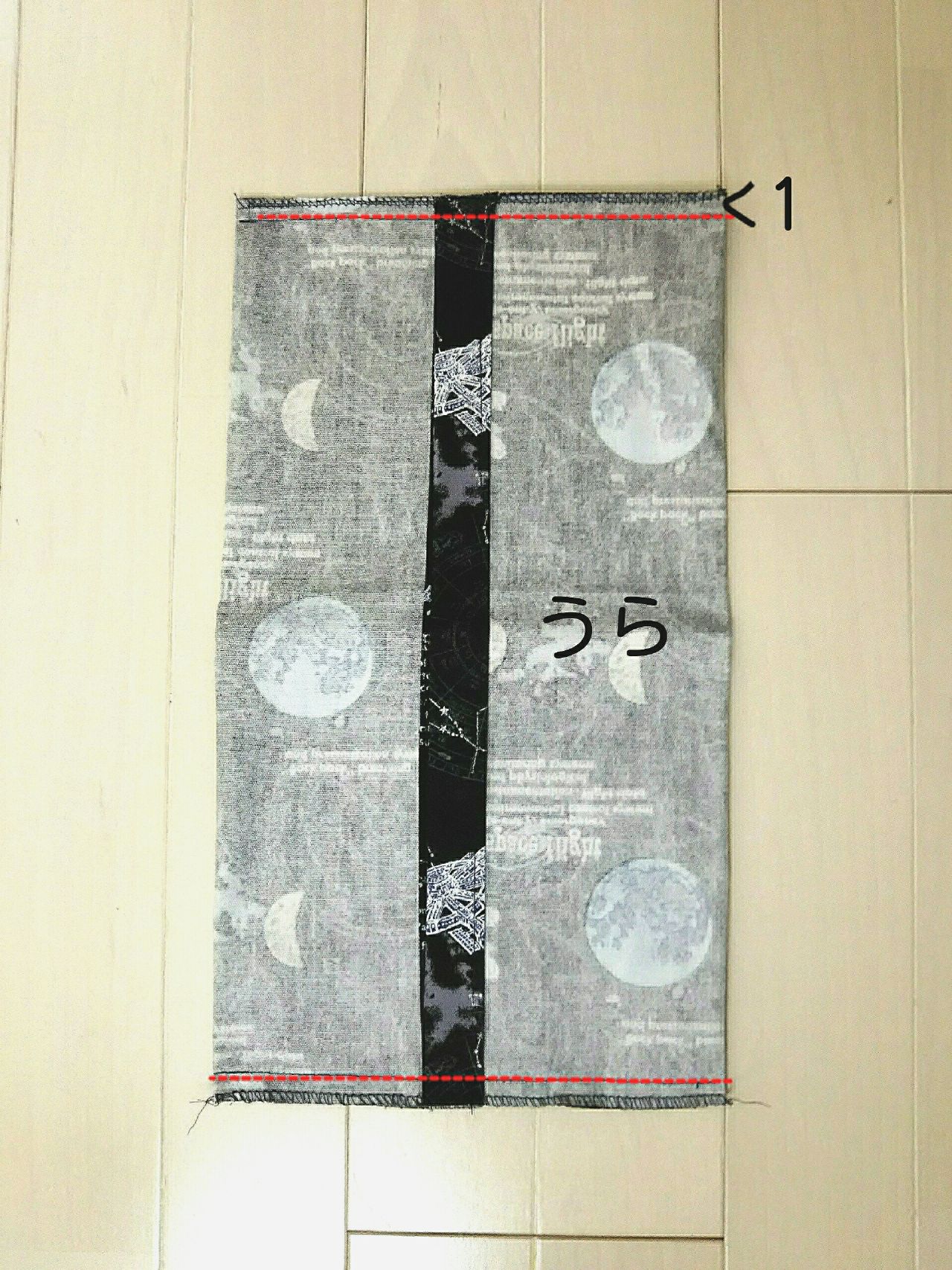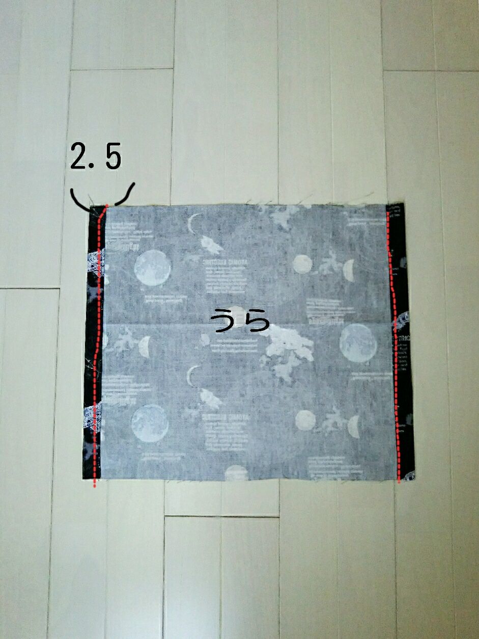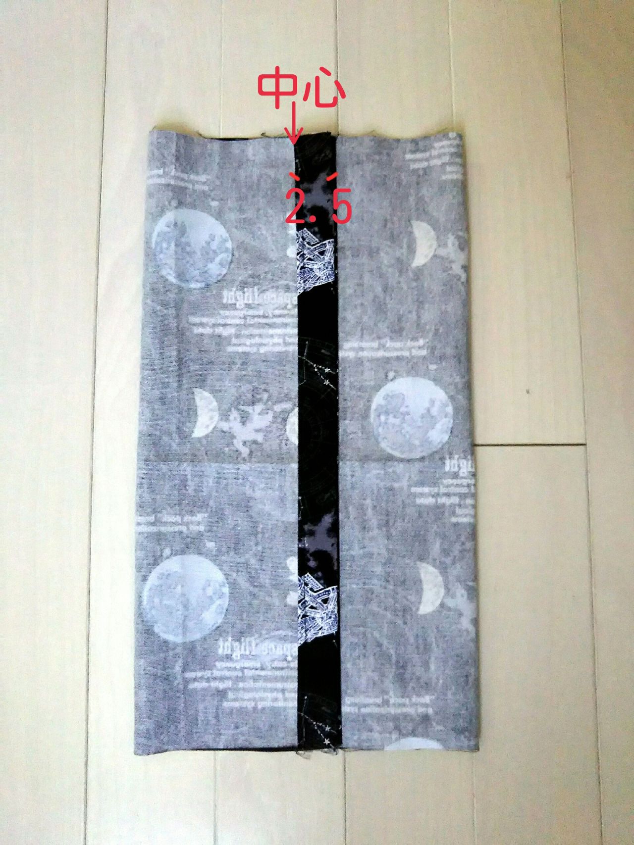 ③右半分を中心線に折り、左半分は中心から2.5㎝重なるように中表に折る。上下を縫い(縫い代1㎝)、ジグザグまたはロックミシンで端の処理をし、表にひっくり返す。
