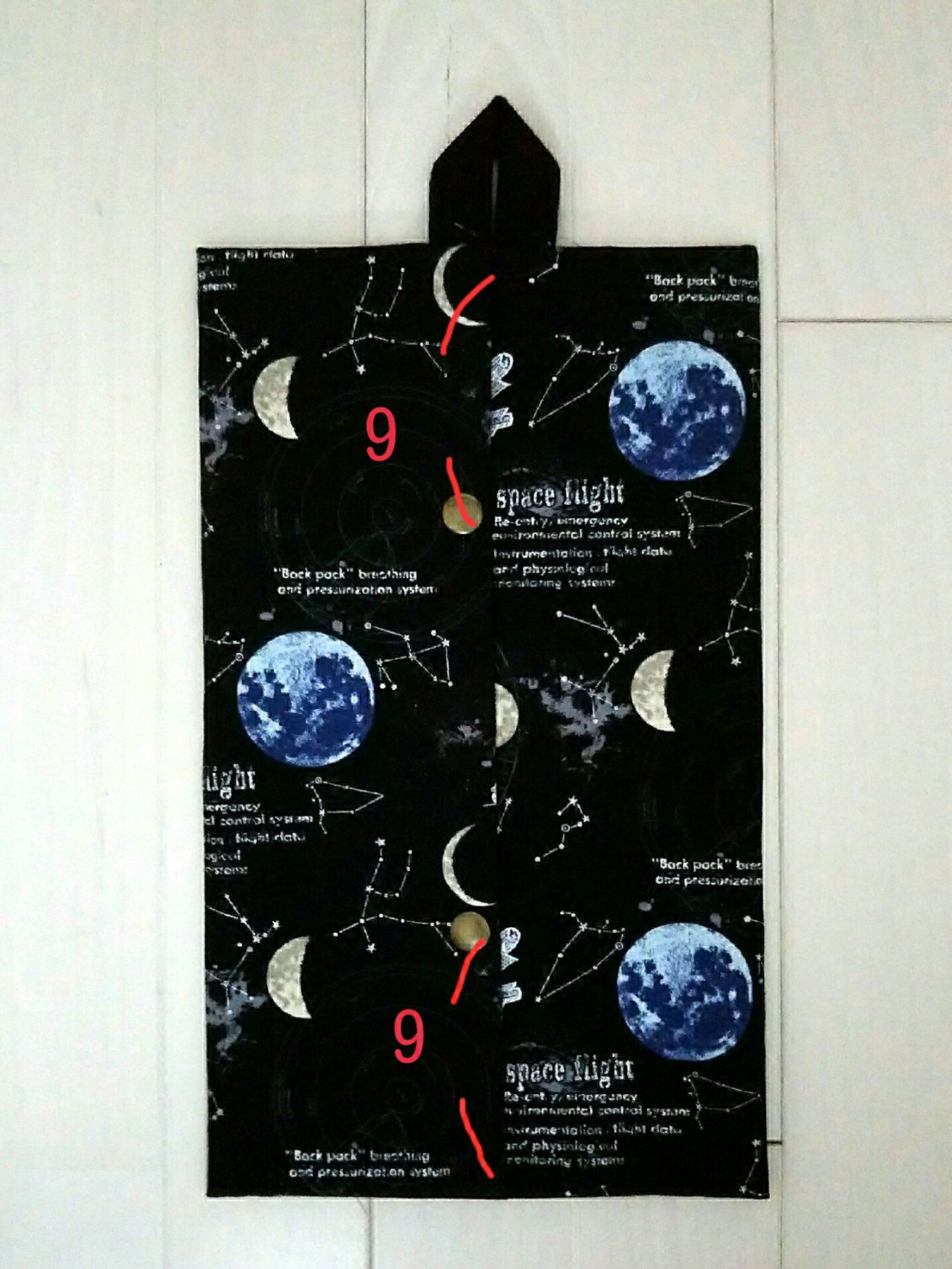 ④重ねた部分に上下それぞれ端から9㎝のところにスナップボタンを付け完成。
