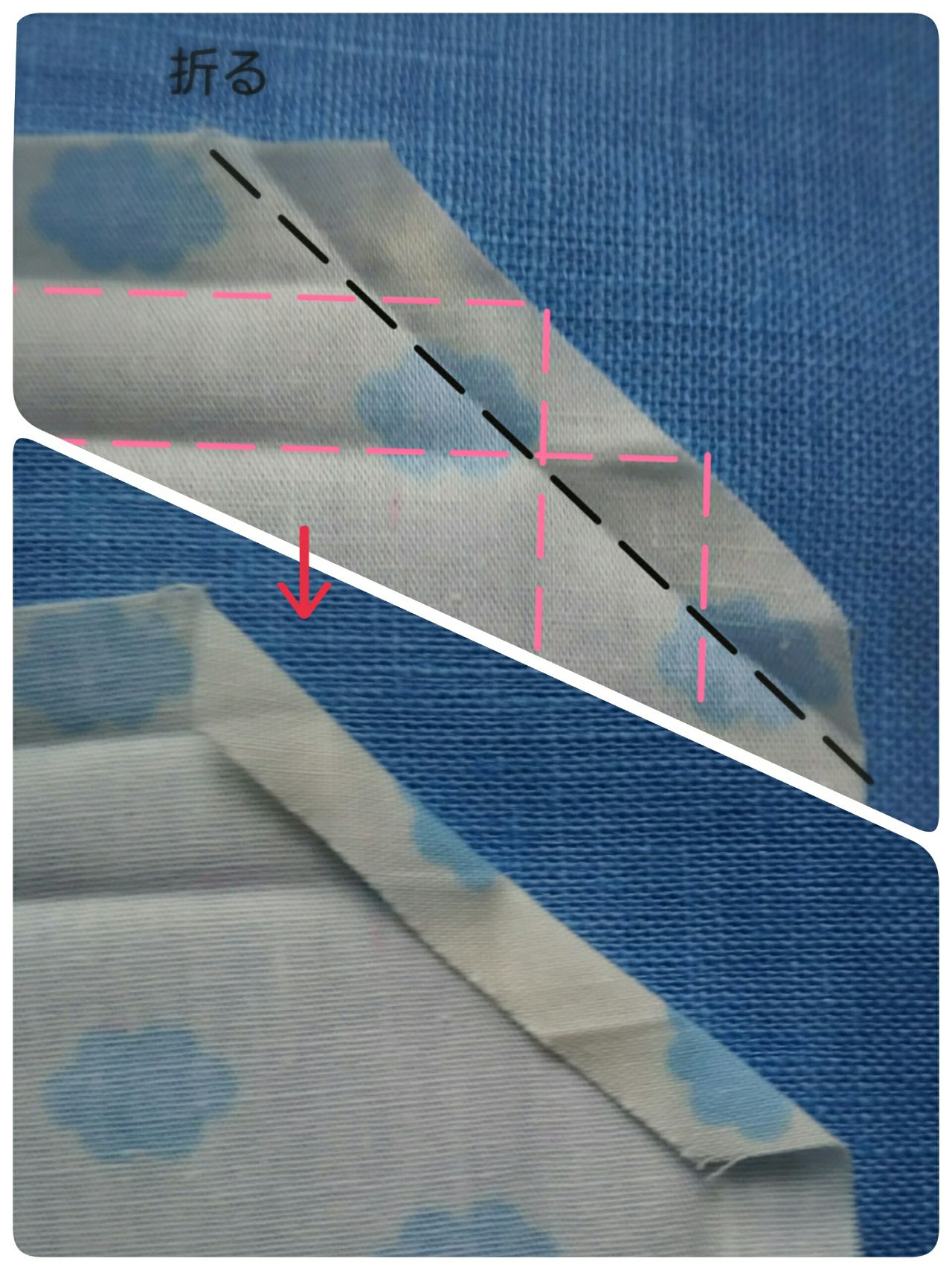 ①それぞれの辺を1㎝の三つ折りにしアイロンでしっかり折り目をつけます。