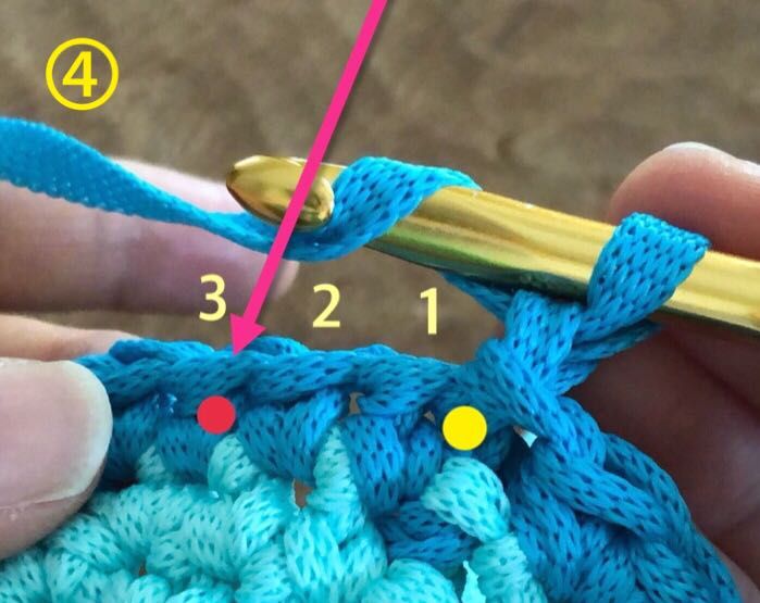 ●印の立ち上がりの目から3目目の●印の前段の細編みの頭2本を拾って長編みを5目編み入れます。