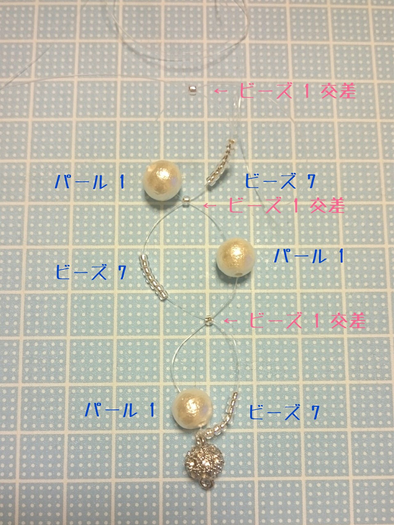 ③ビーズ1コにそれぞれのテグスを通して交差します。