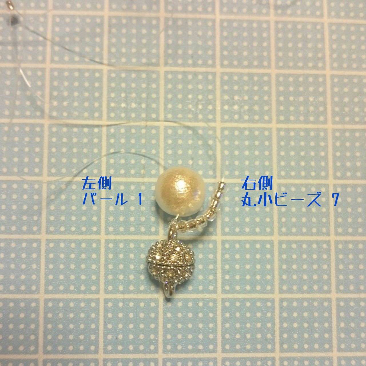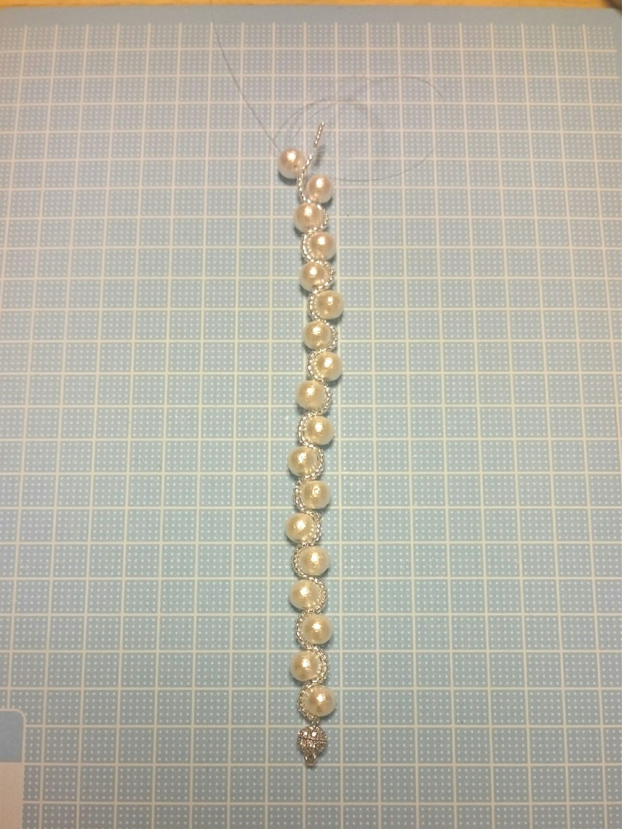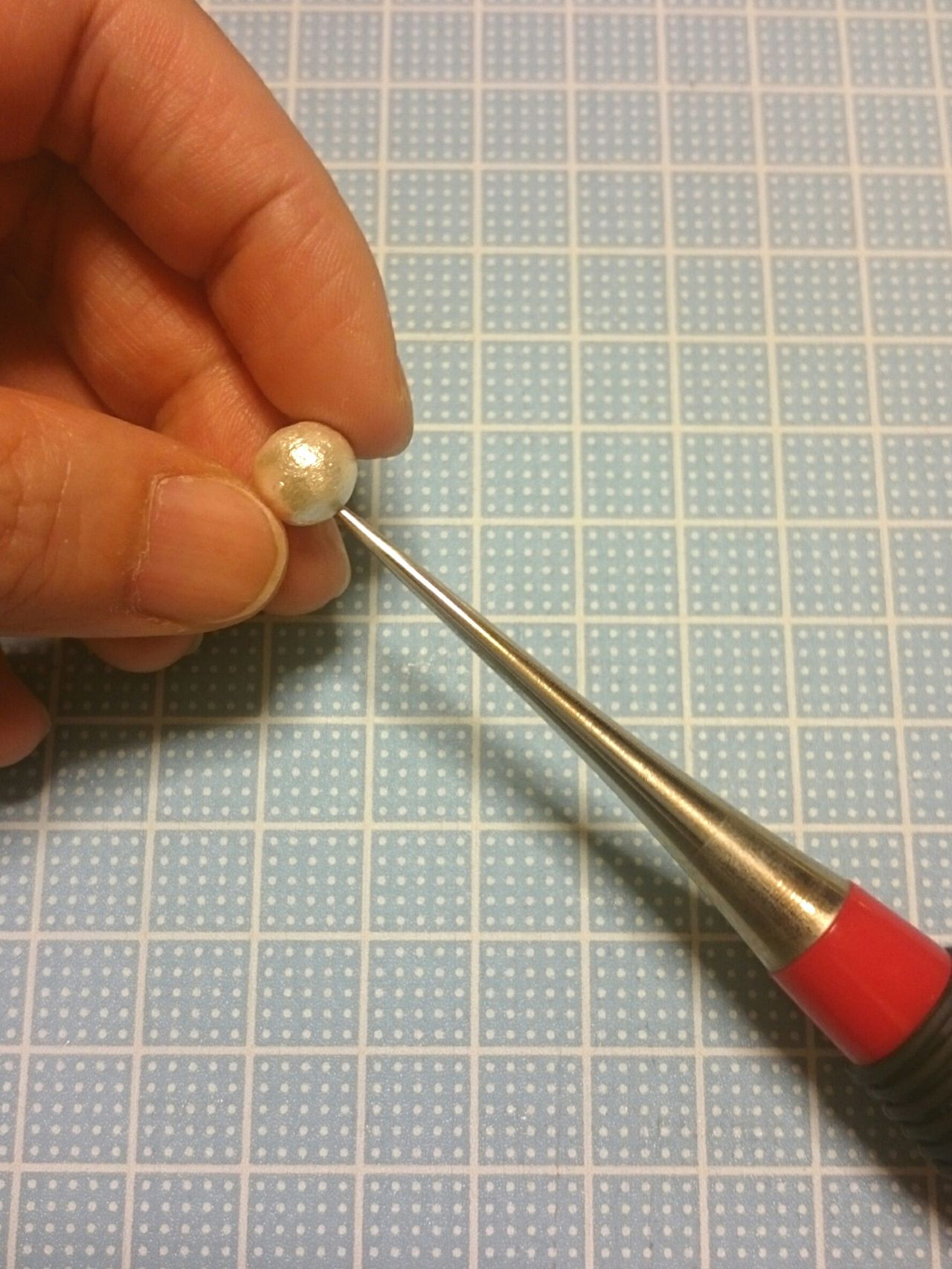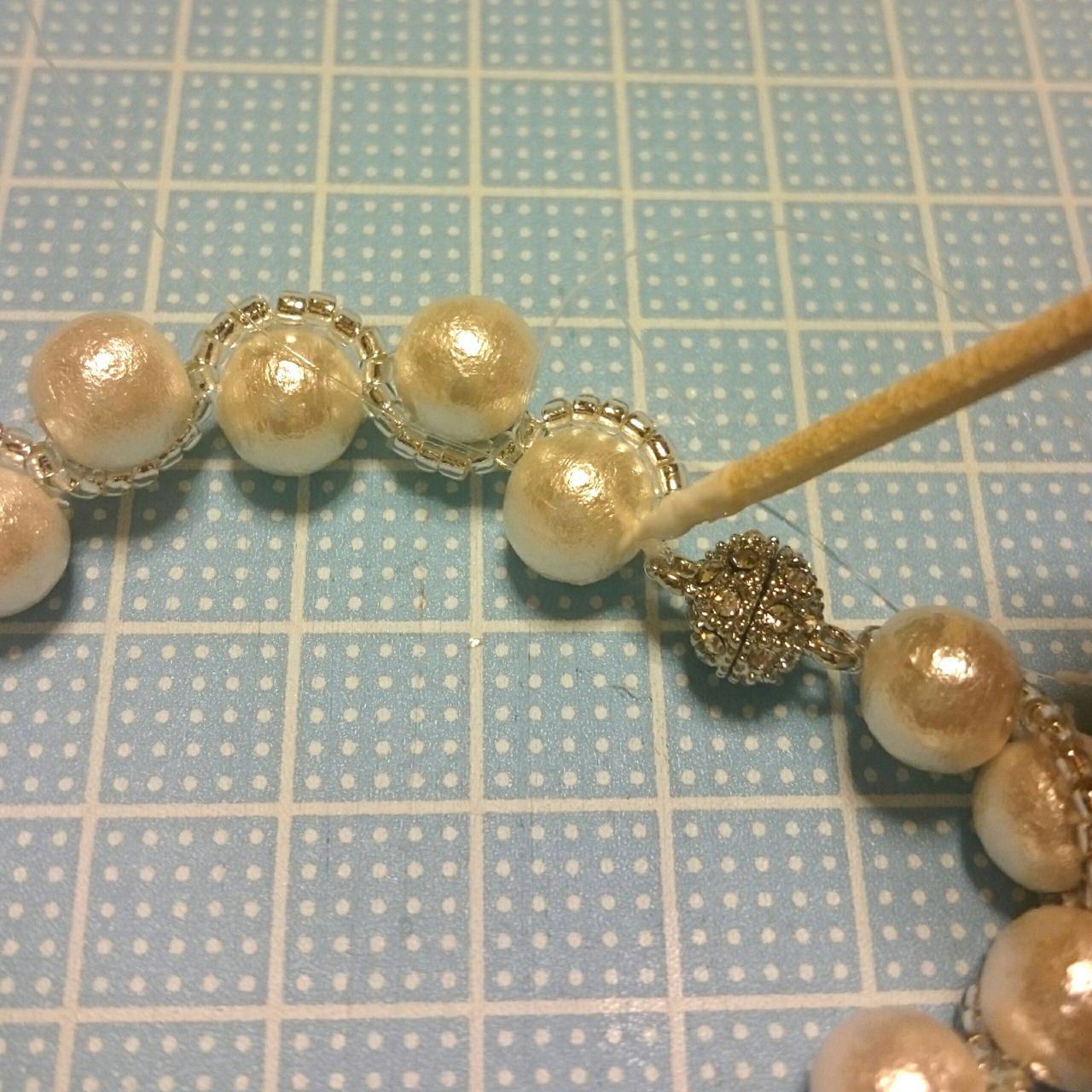 コットンパールは穴が狭いので、目打ちなどで穴を広げておきましょう。テグスが通りやすくなりますよ(’-’*)♪
