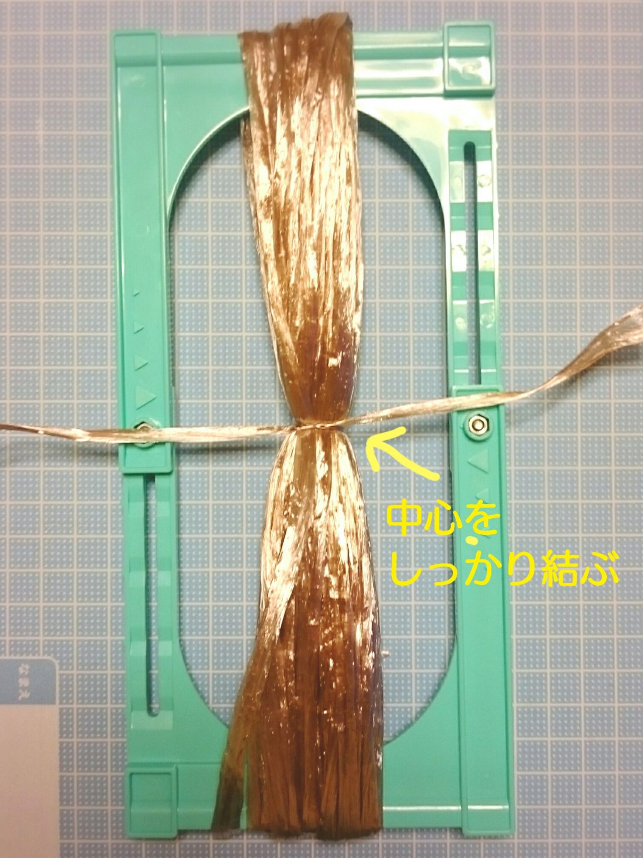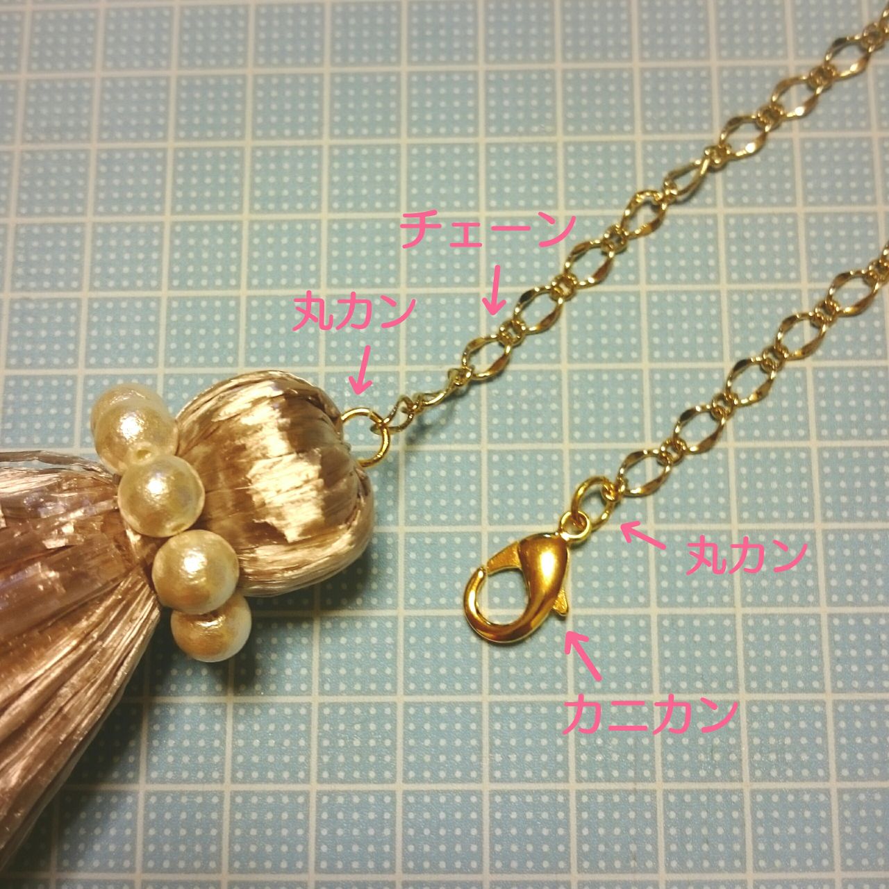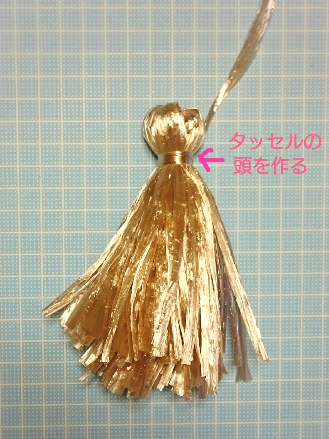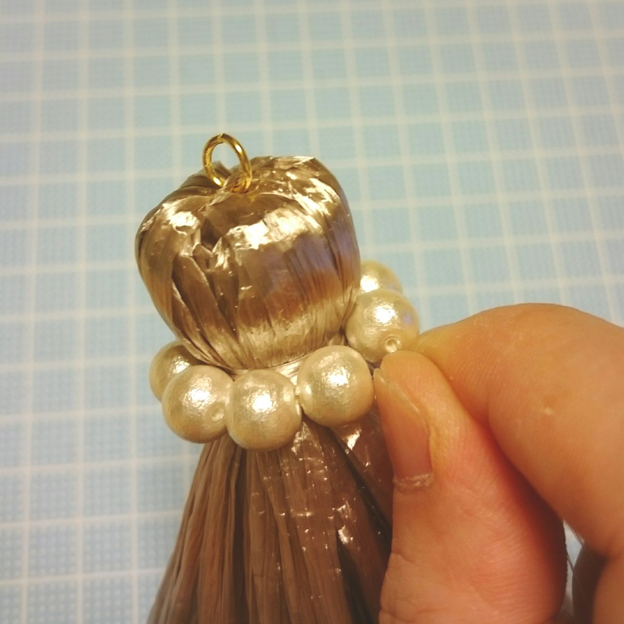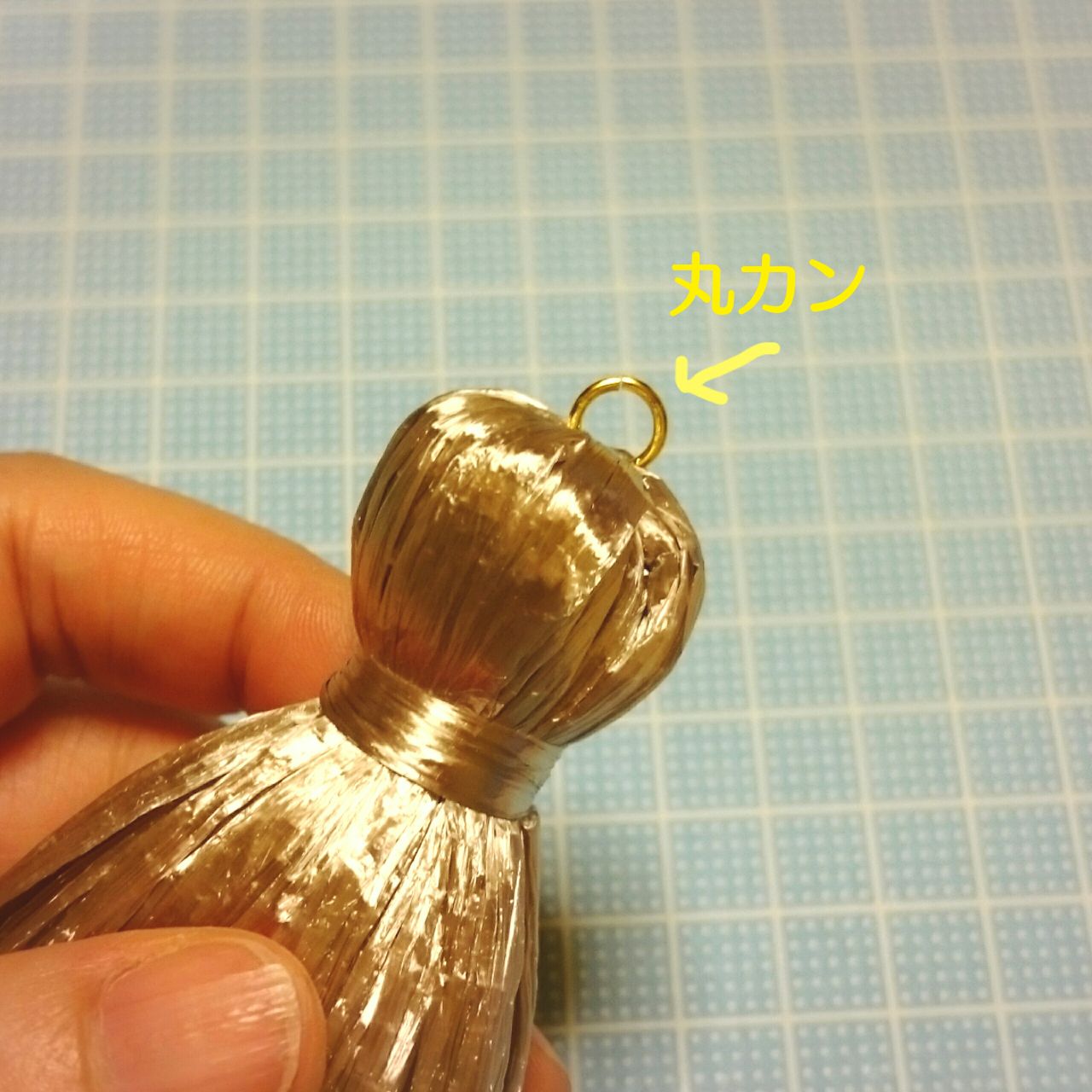 頭の上のタッセルを結んだ糸に、丸カンを付けます。