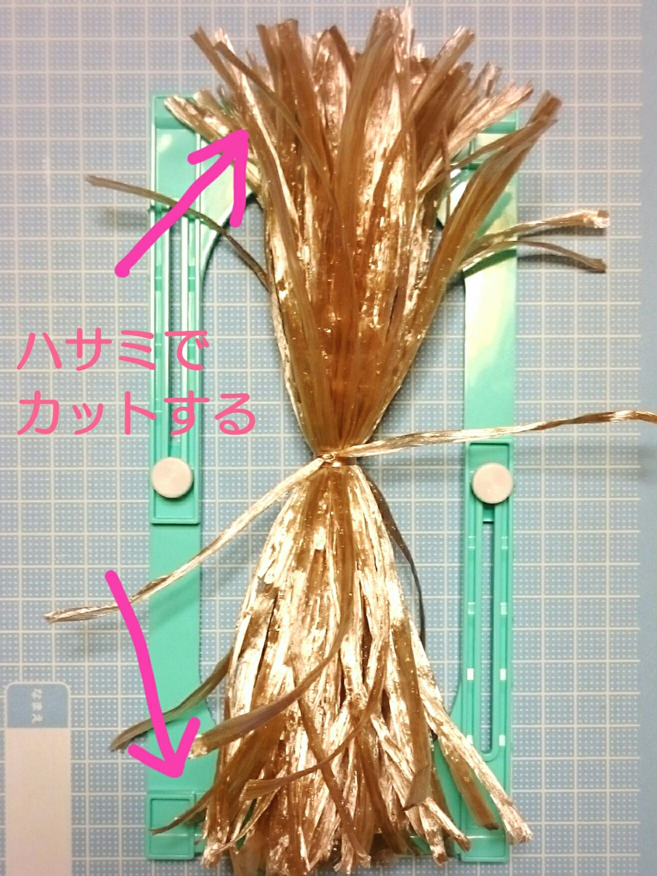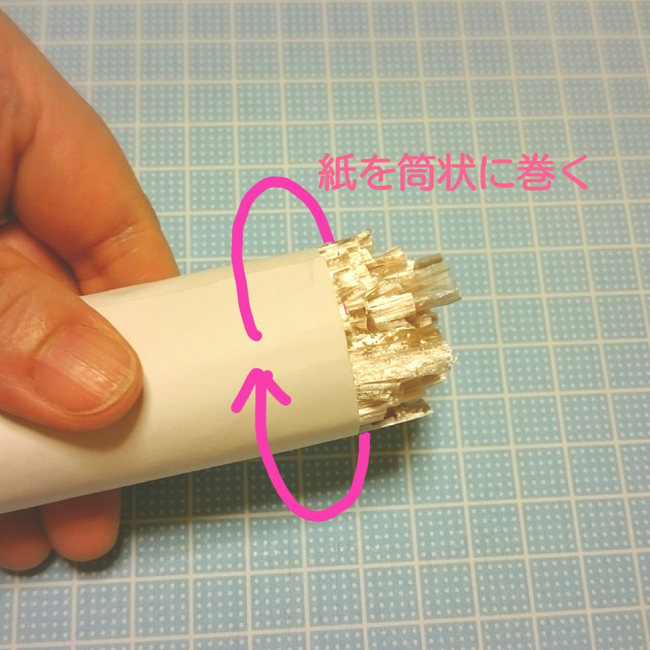 ④紙を筒状に巻いて、頭の上から10cmのところで切り揃えます。