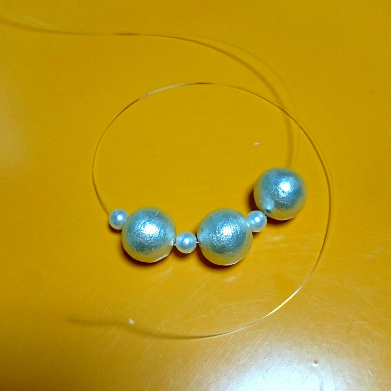 ⑤コットンパール&ビーズをテグスに通して輪にして結びます。