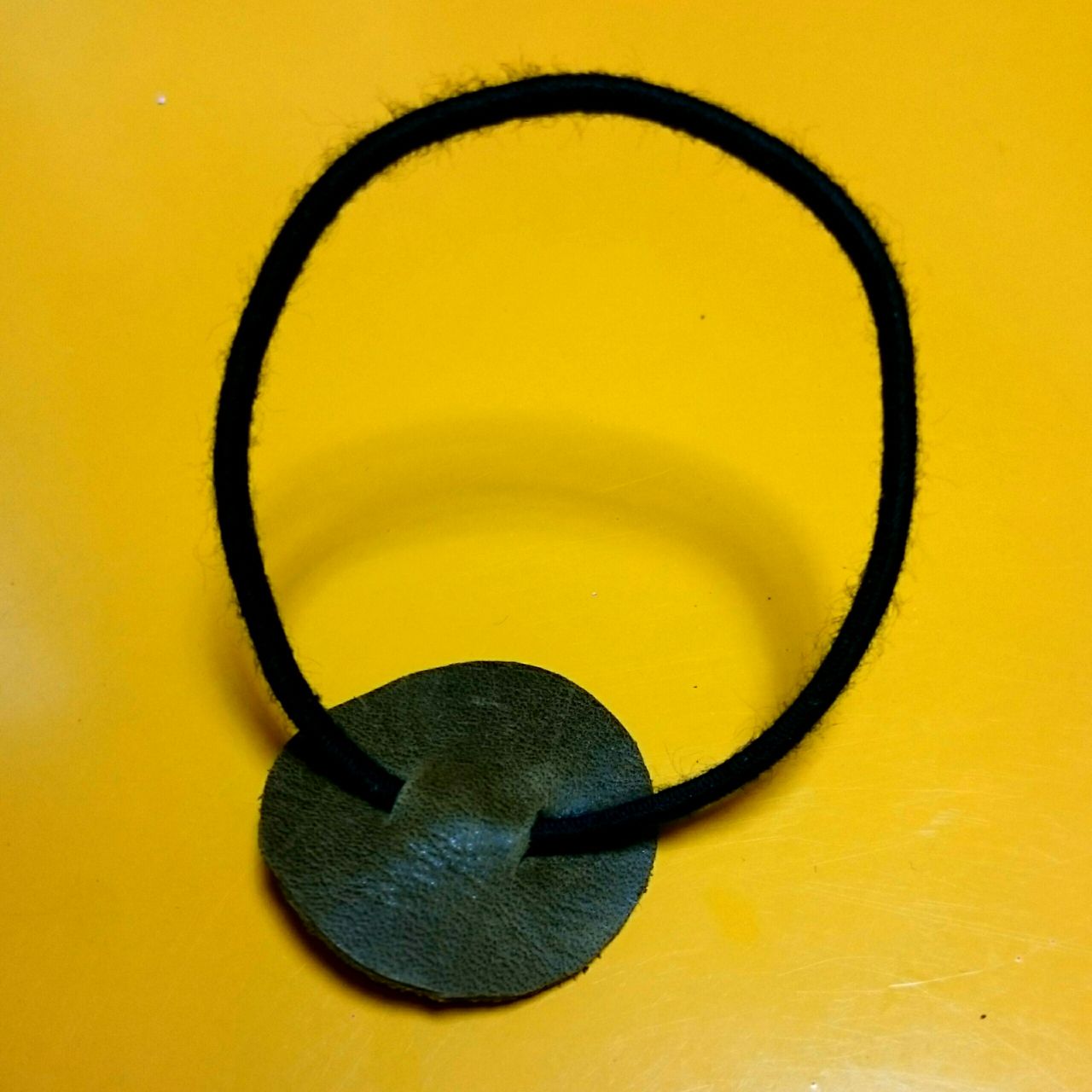 ⑥革を丸くカットして、切れ目を入れて丸ゴムを通します。