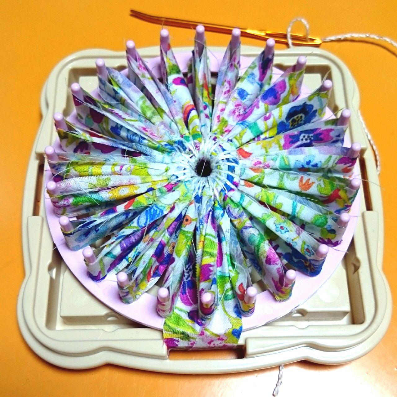 ①リバティ生地を、約1cm幅で、リボンのように細長くカットします。私はロータリーカッターを使いました。