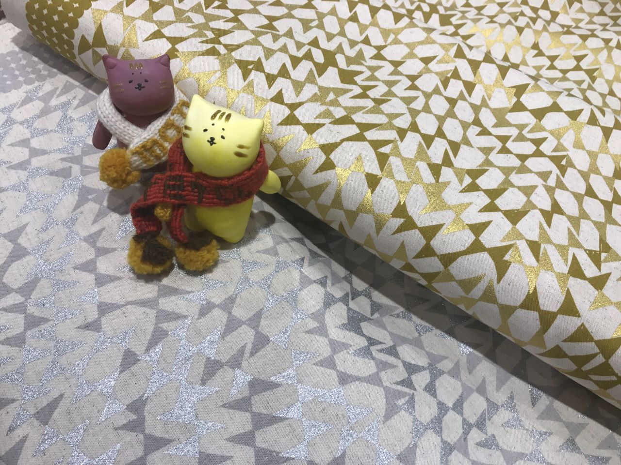 リボン?かと思いきや三角??面白い柄が素敵な生地!色もシルバーとゴールド展開で目を引くデザインが素敵でしょ?