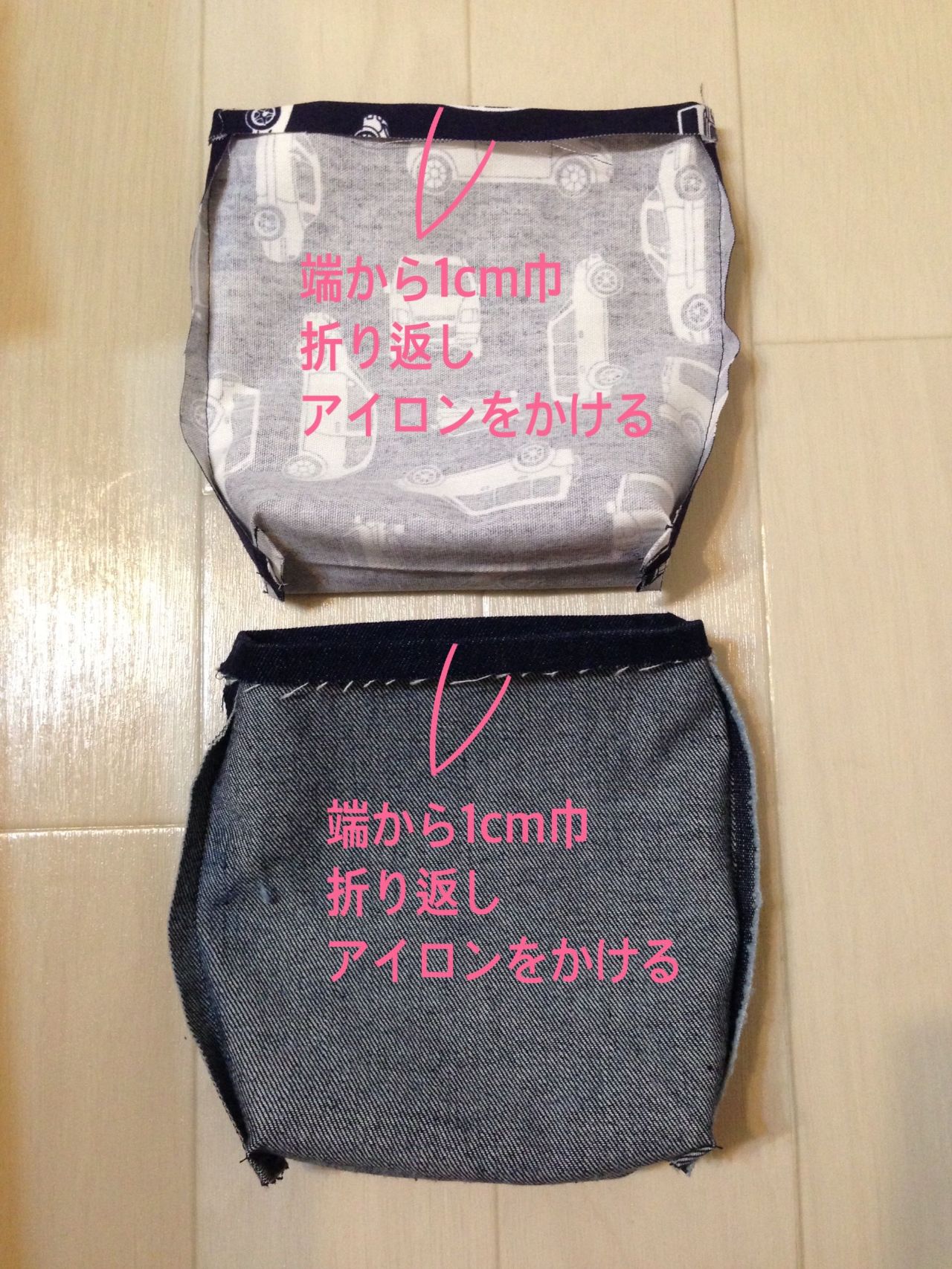 ⑥表地と裏地のポケット口の縫い代1cmをアイロンで折ります
