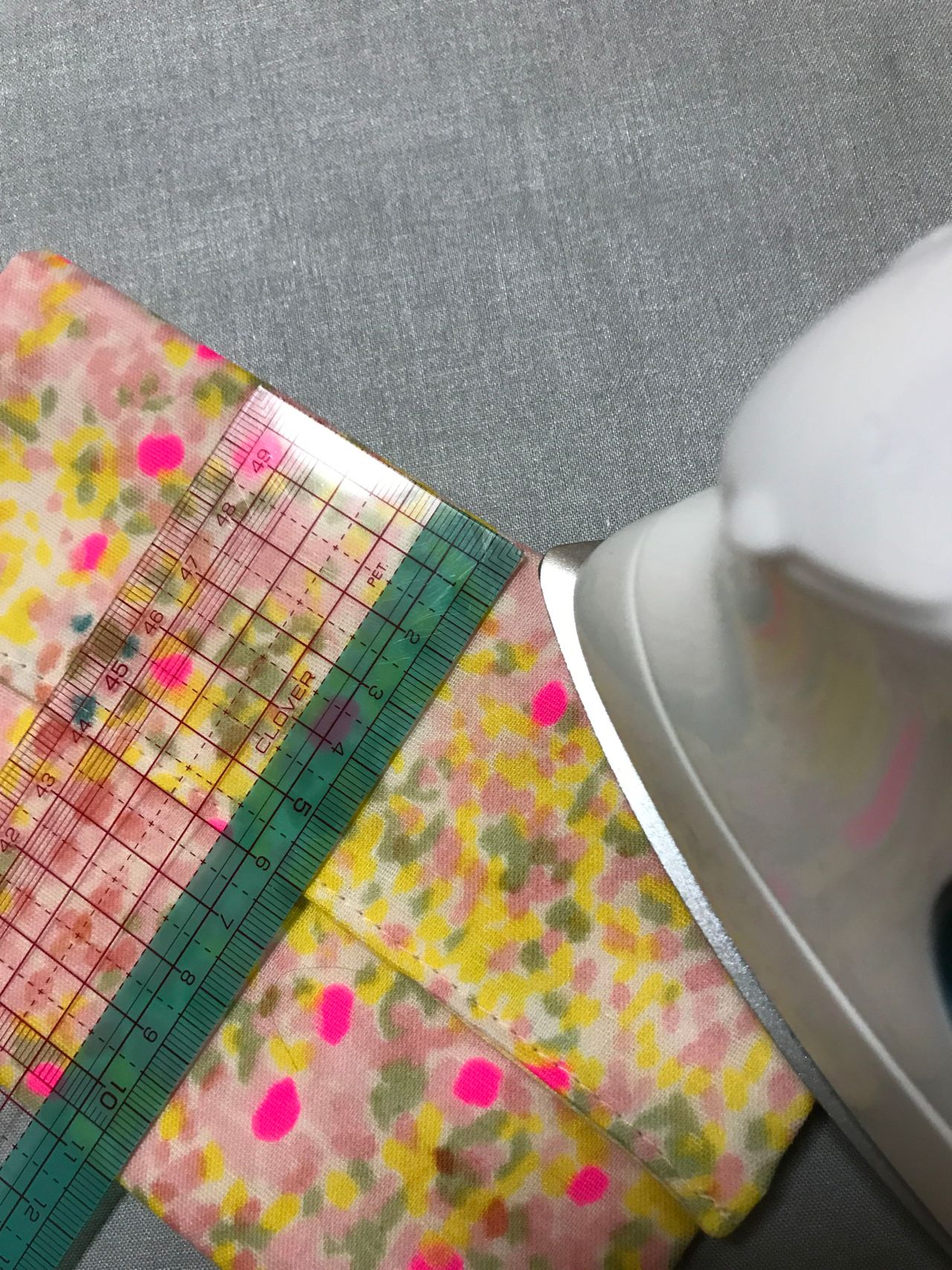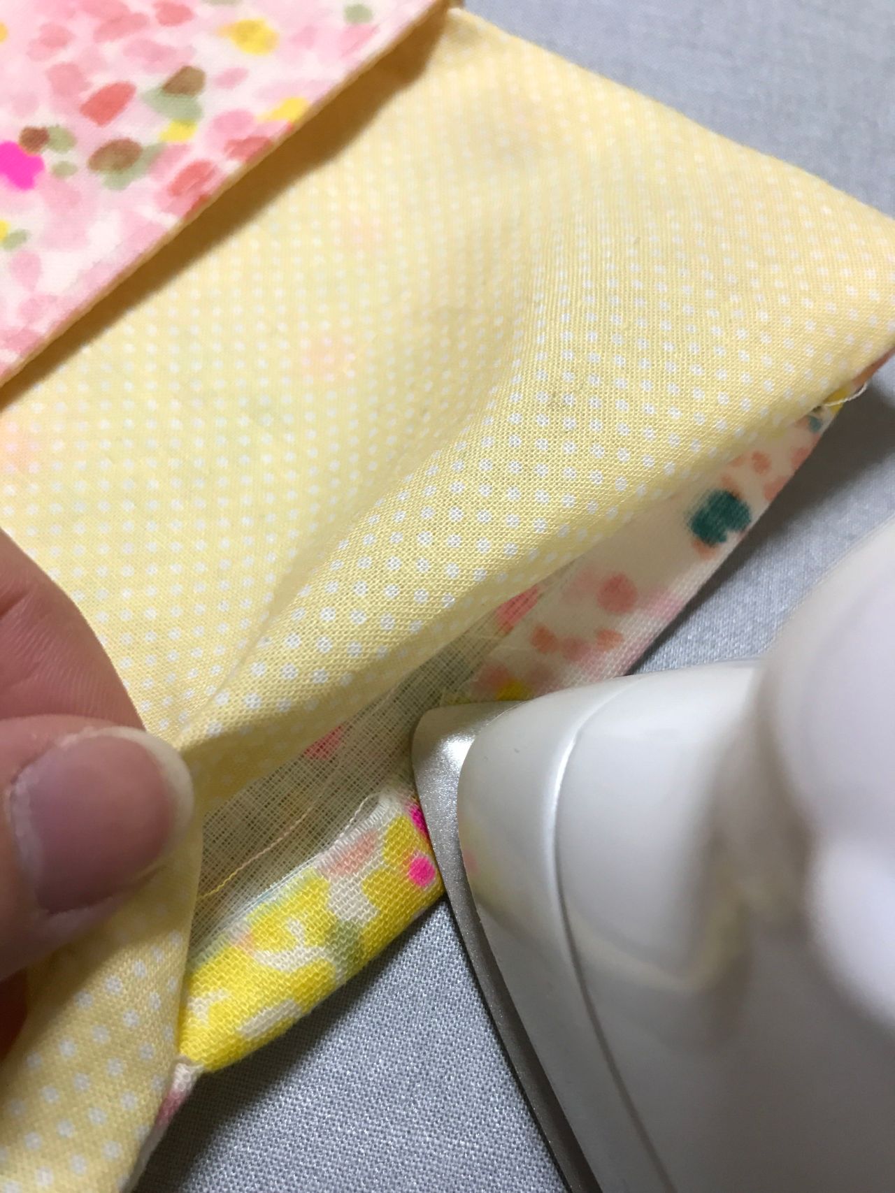 返し口の縫い代をアイロンで折って、表からステッチをかけます。