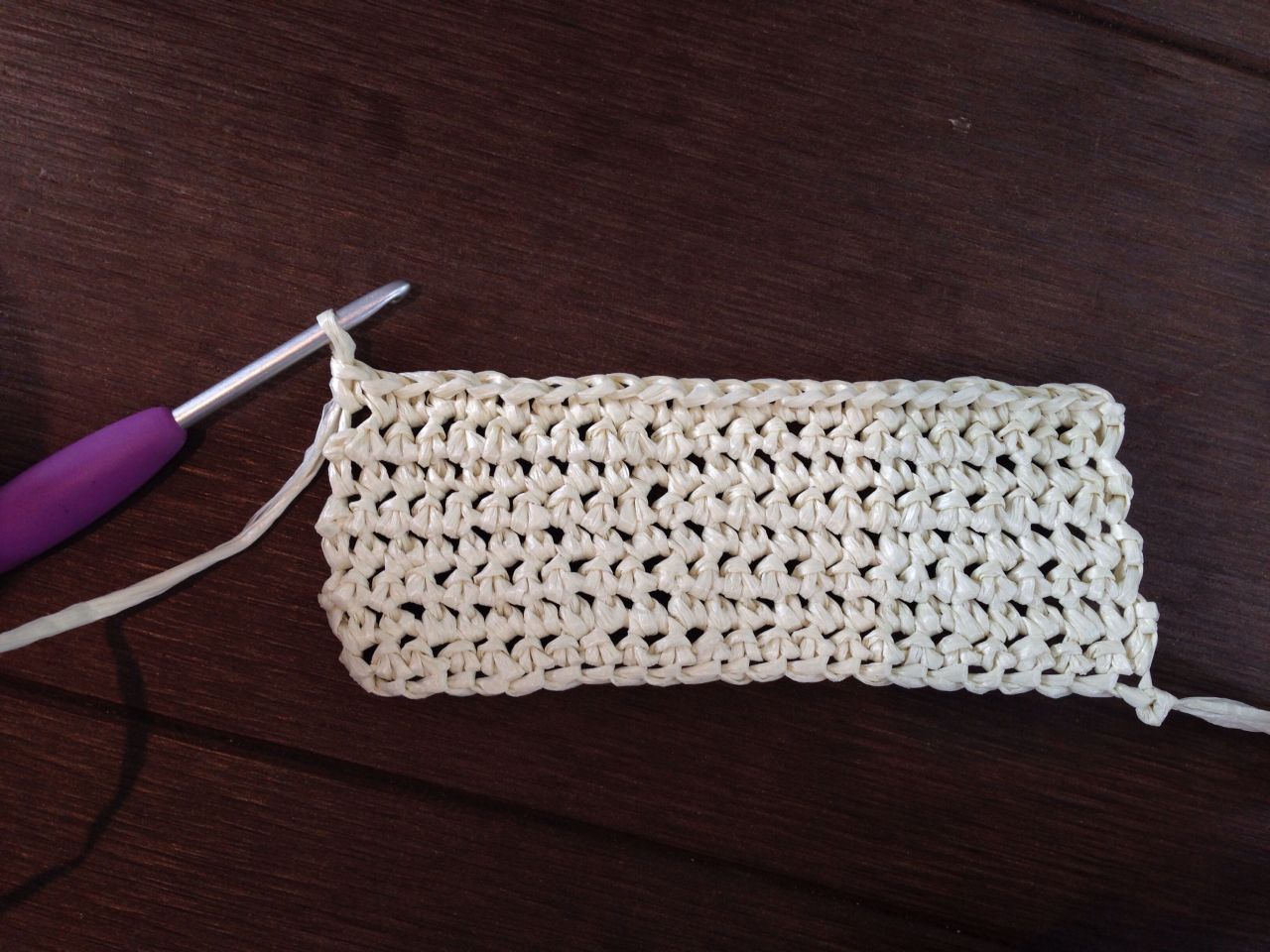 ①鎖23目の作り目を作り、往復編みで細編みを8段編みます〈底の部分〉