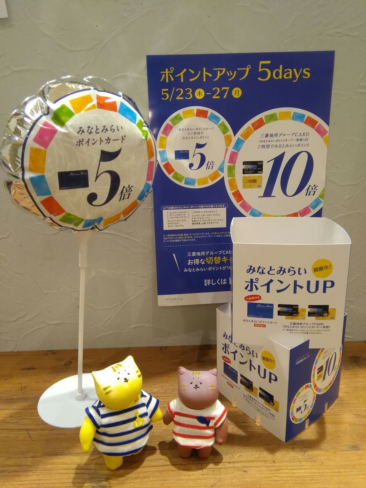 *ポイント5倍DAY 期間中のお買い上げはみなとみらいポイント5倍残りの5倍は5/29にお付けして合計でポイント10倍。