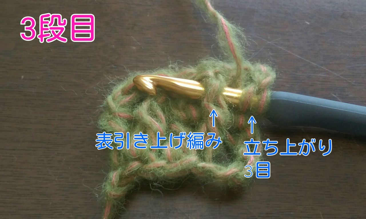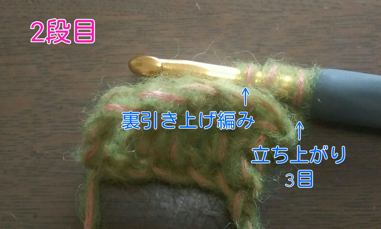立ち上がり3目→裏引き上げ編み1目→長編み1目→裏引き上げ編み1目→長編み1目
