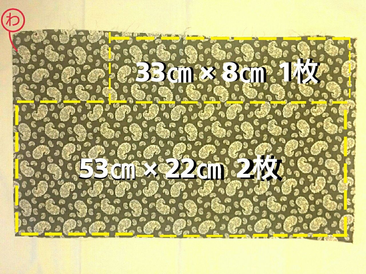 中表に半分に折ったら、長い直線部分(53cm)を、ぬいしろ 1cmで縫って、角を切り落とします。