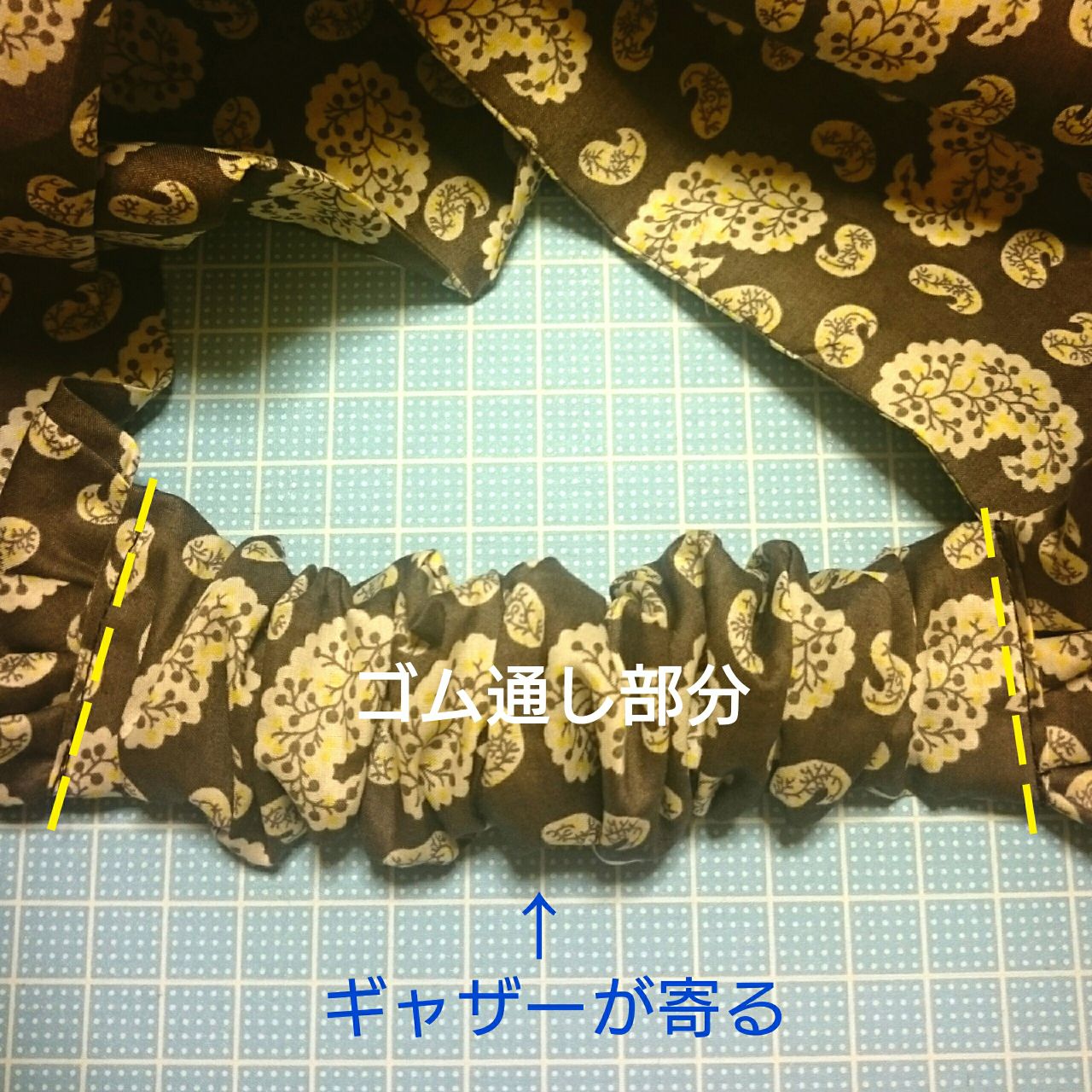 ⑤本体部分の端を2枚一緒にぐし縫いして軽くギャザーを寄せたら、ゴムを縫いつけます。