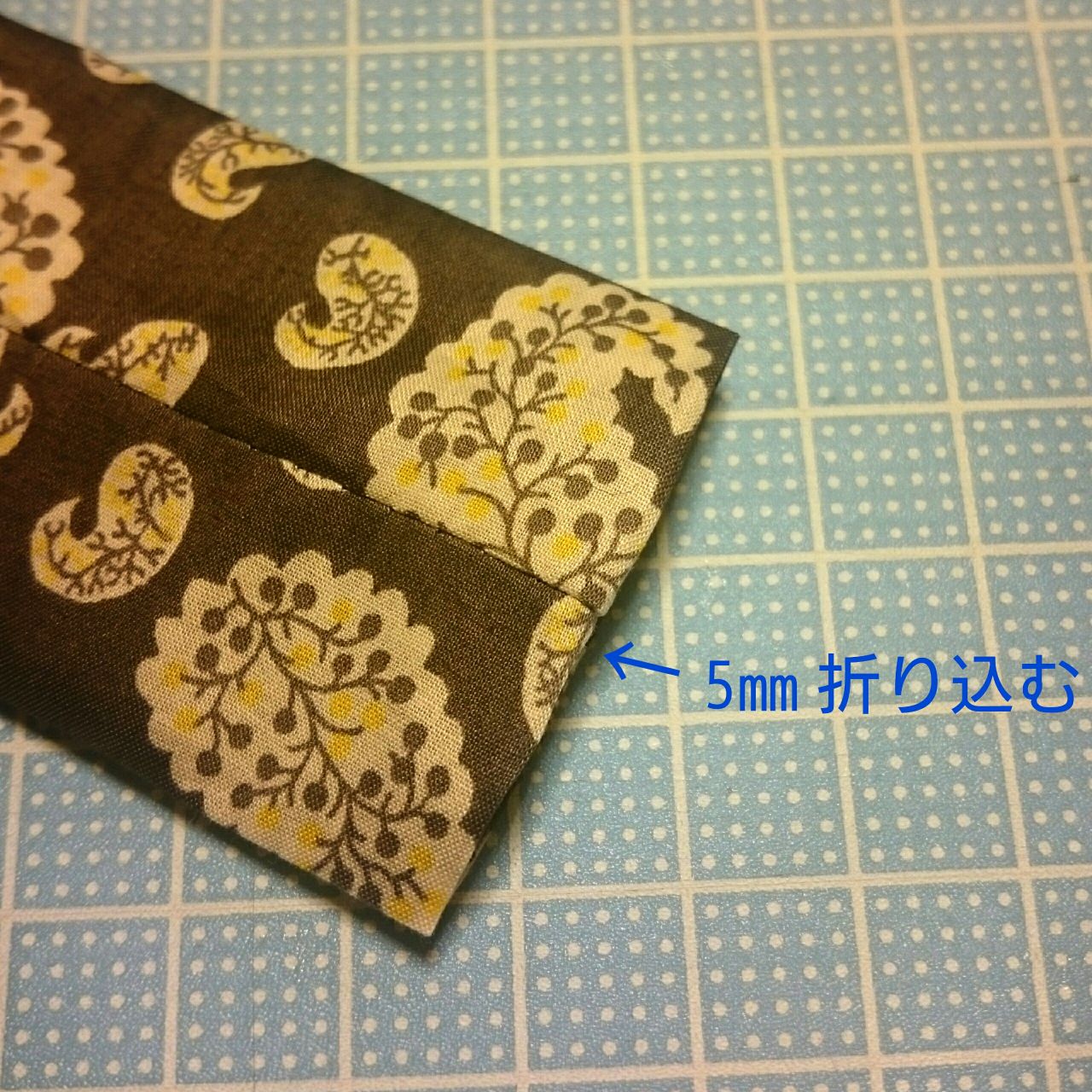 ぬいしろを開いて裏返したら、縫い目を中央にして、端を 5mm折り込んで、アイロンで整えます。
