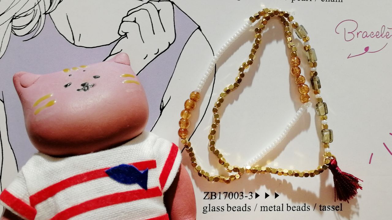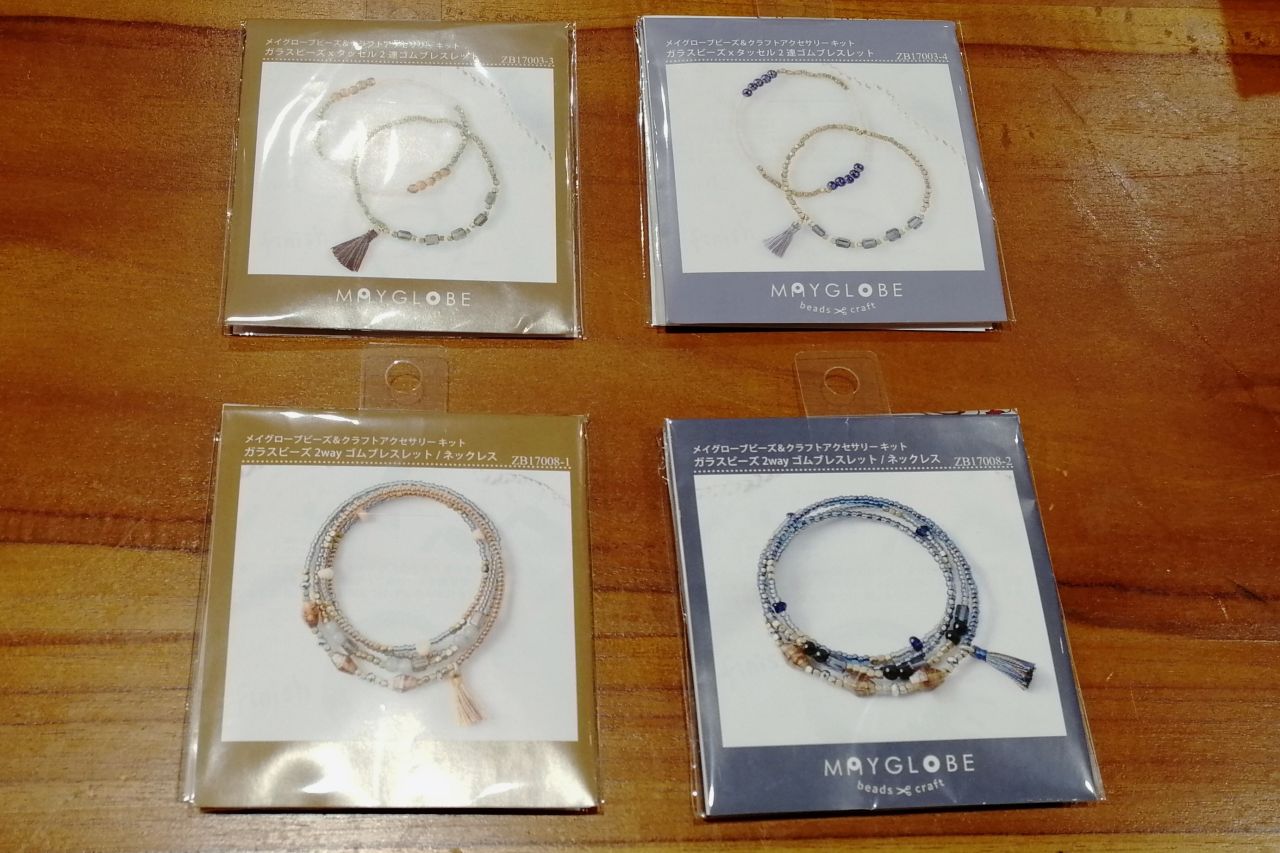 初めての方でも挑戦しやすいビーズをゴムに通すだけのタイプ(写真上)と、パーツを繋げる中級者の方にもオススメのタイプ(写真下)があるよ!!