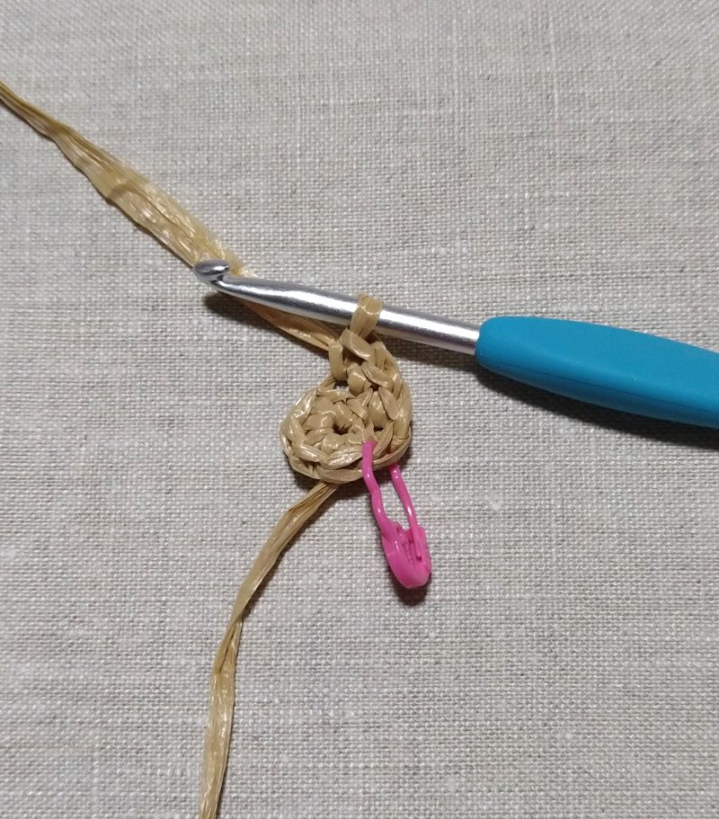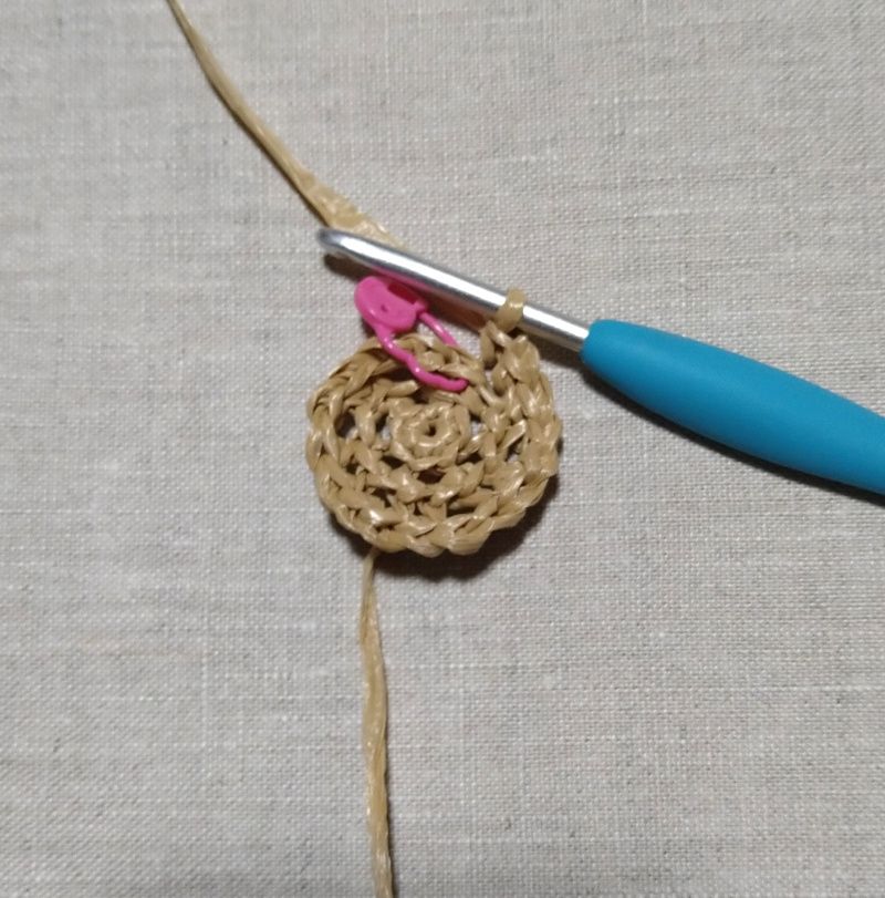 立ち上がりなしで、ぐるぐる編んでいくので次の段に入る時にマーカーしましょう。