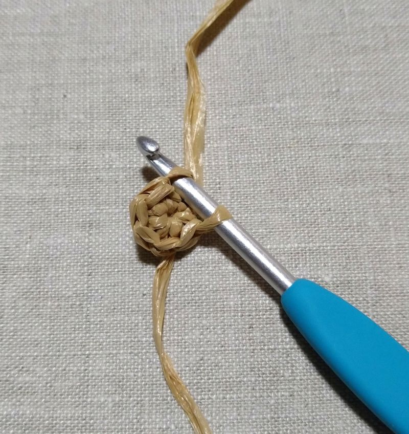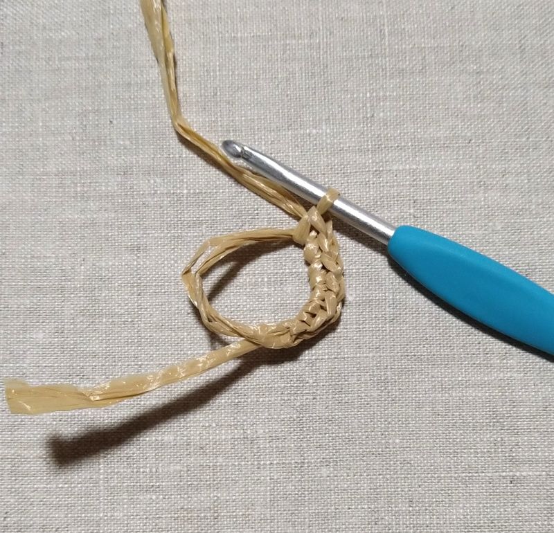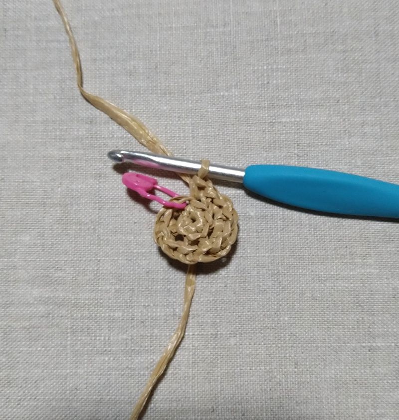 ①輪の作り目からぐるぐると細編みのすじ編みで編みます。作り目6目で毎段6目ずつ増やし目をし、11段まで編みます。