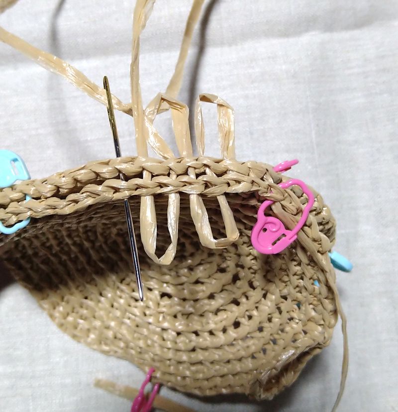 外表に重ねてピンクの段数マーカーの印から印までコの字とじします。