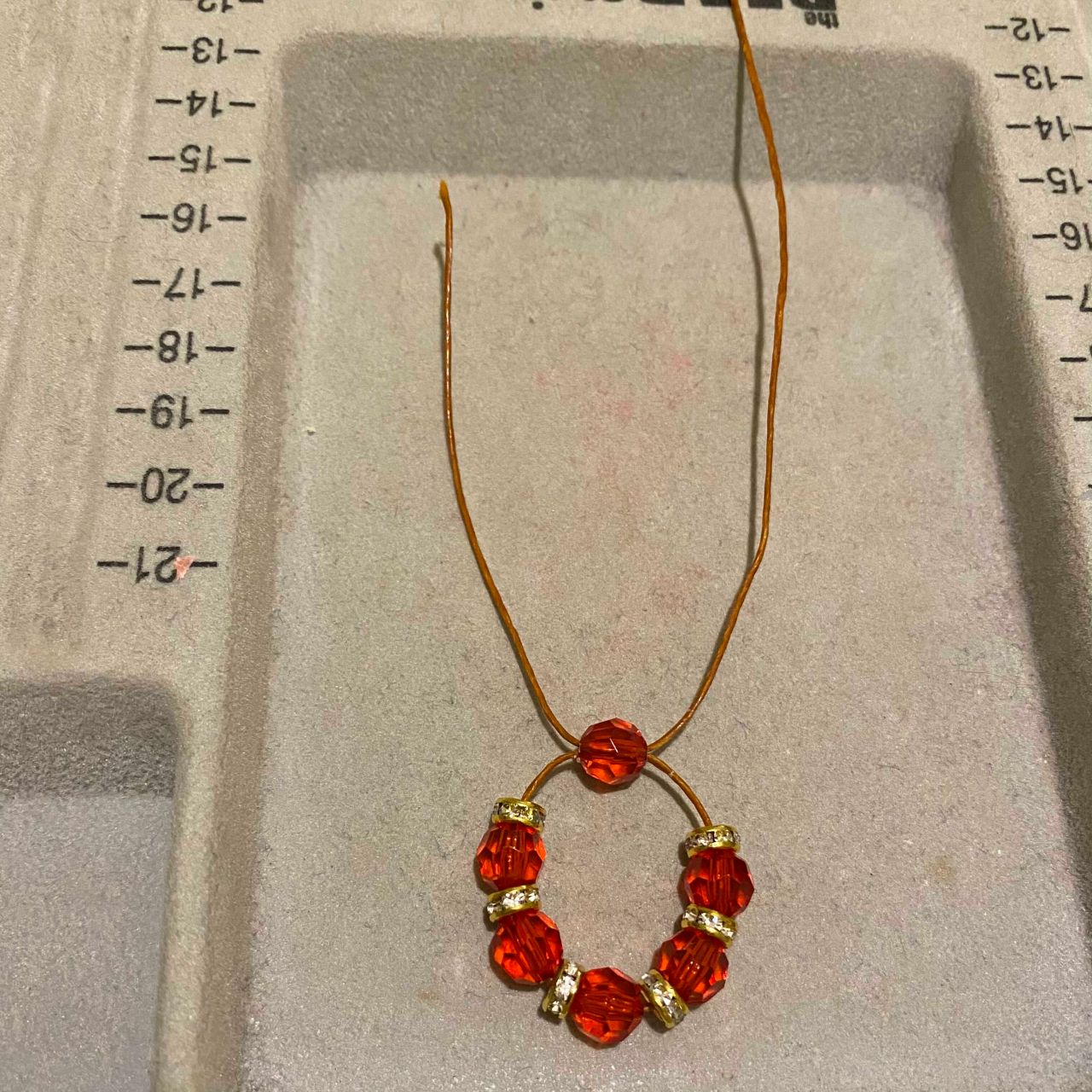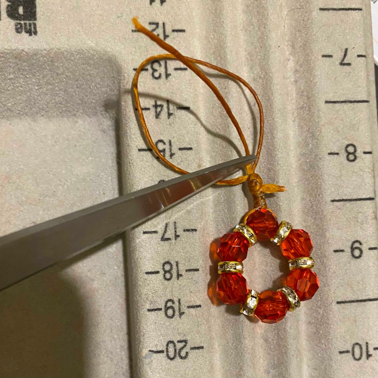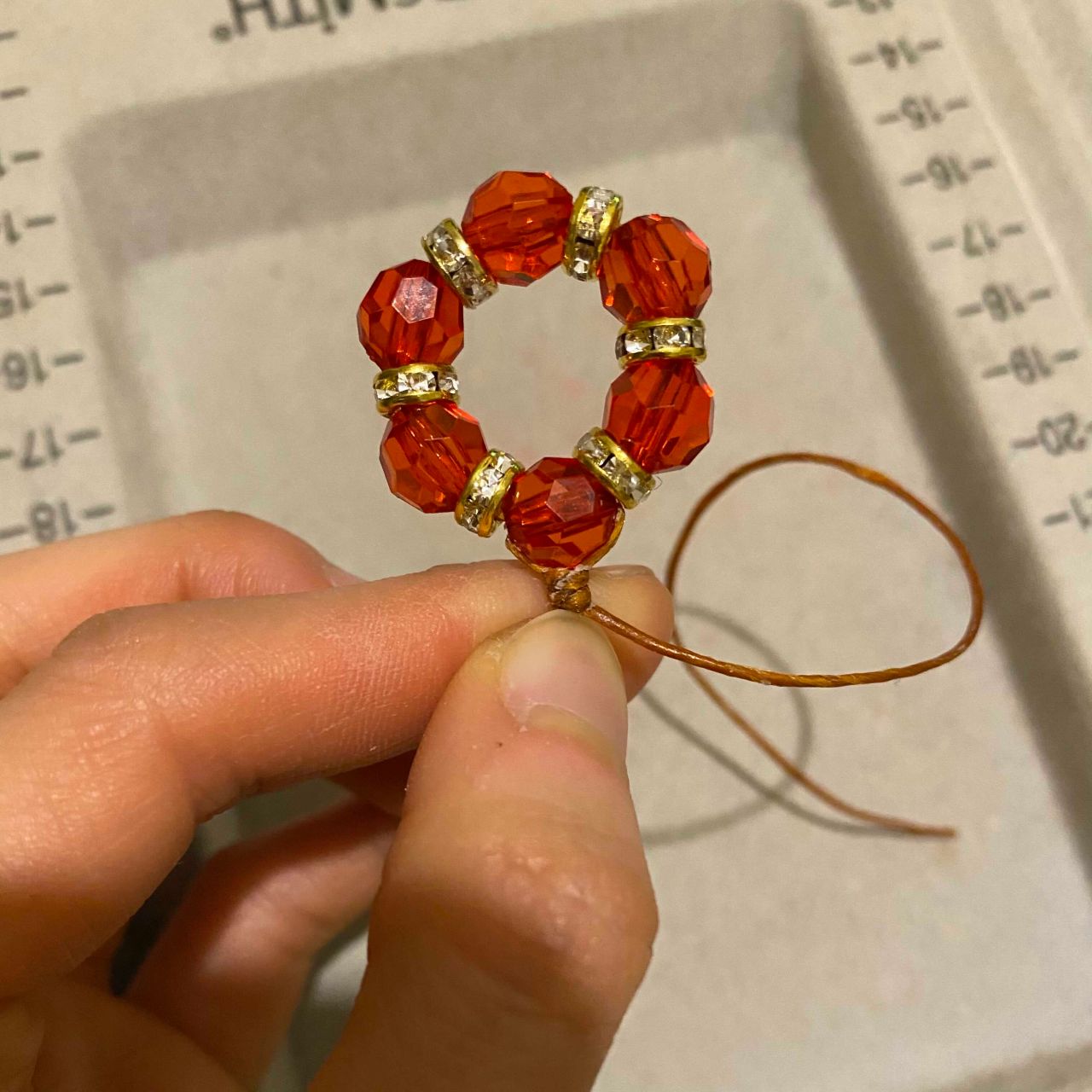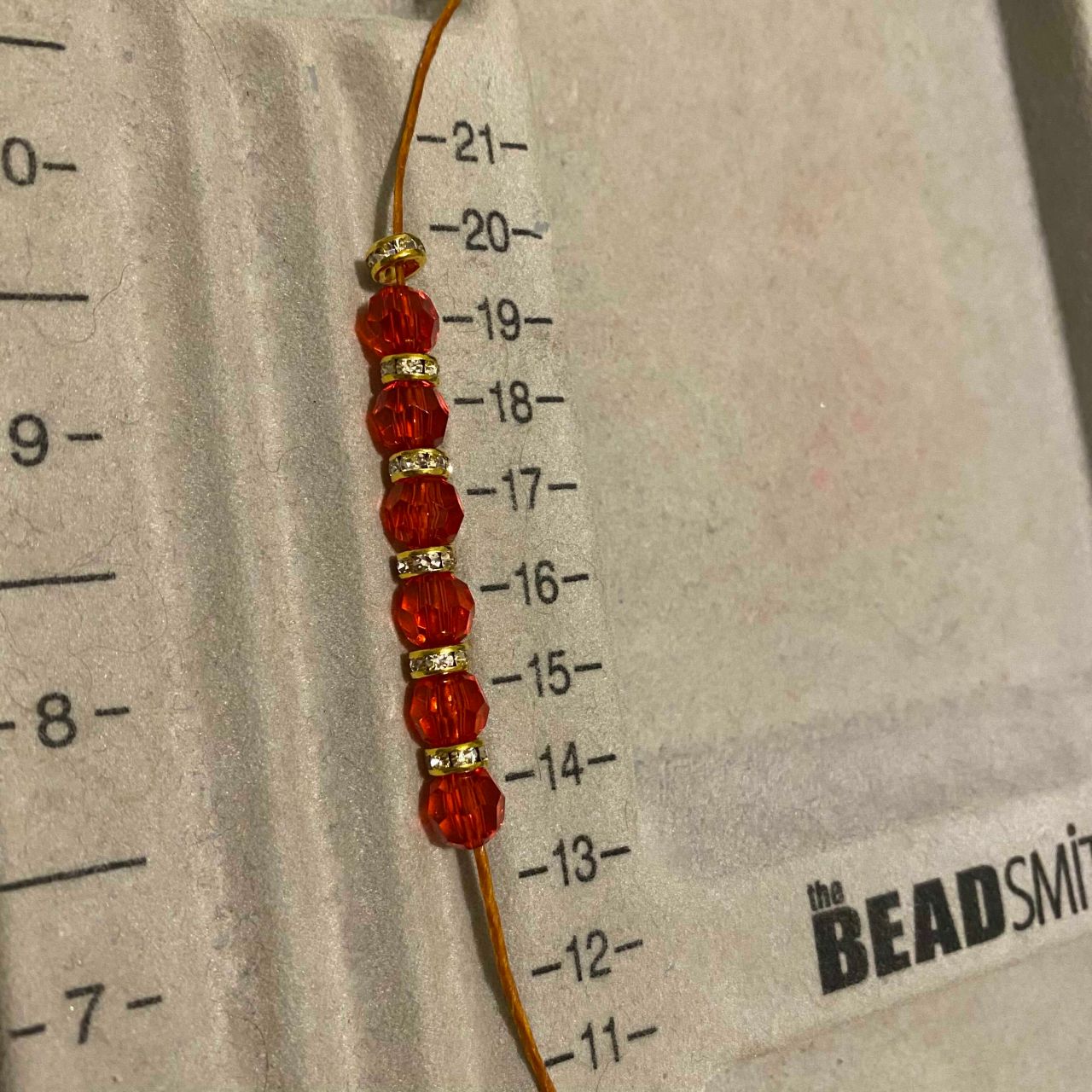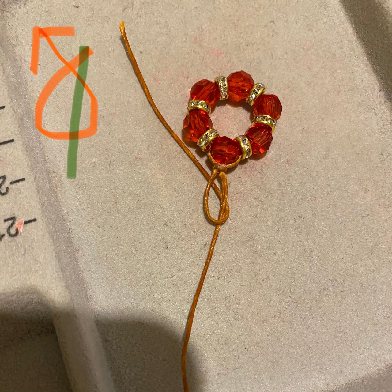 ロウビキ紐にクラフトビーズとロンデルを交互に通します。
