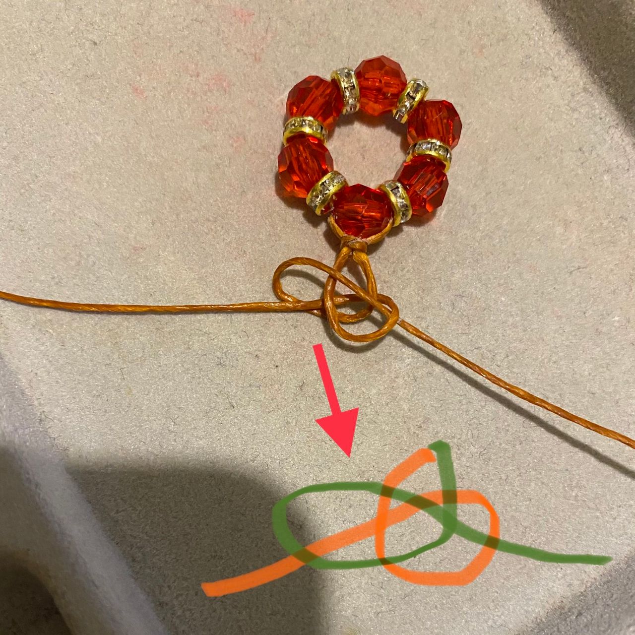 左側の紐をくの字に曲げて2本の紐で4の形をつくります。