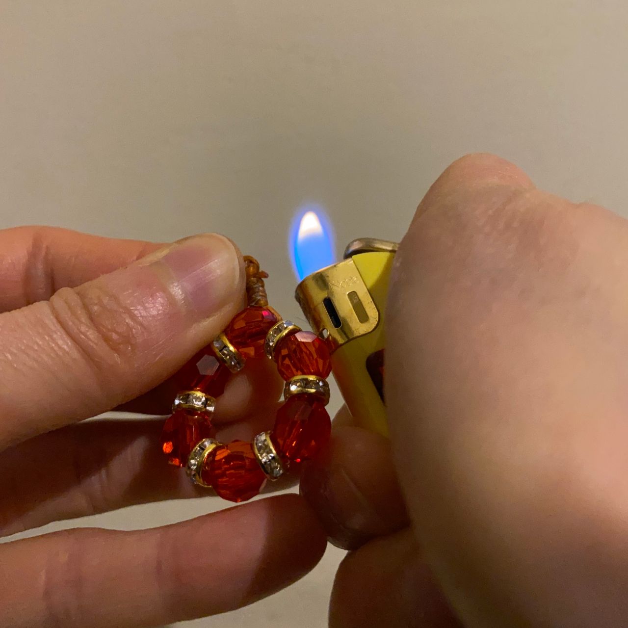 熱いのでライターの角を使ってチョンチョンと紐にくっつけてください。