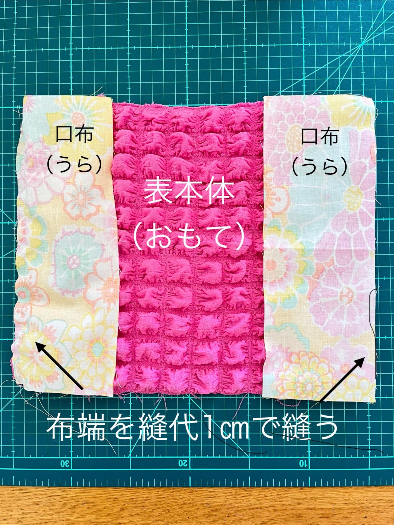 表本体の表面に口布を中表に重ねて縫代1cmで縫い1枚の表布を作ります