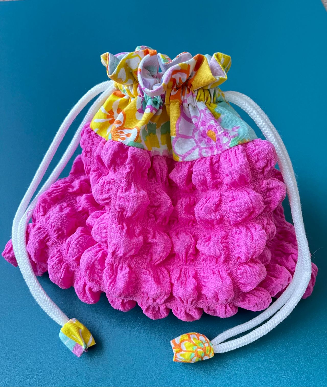 作り方の詳細は『COTTON FRIEND冬号』商品コード4910136250148(¥1,430)を参照くださいね今回使用したポコポコワッフルニット1枚でこの可愛らしい巾着とエコバッグサイズもお作りになれます!エコバッグの作り方レシピは店舗で配布してます