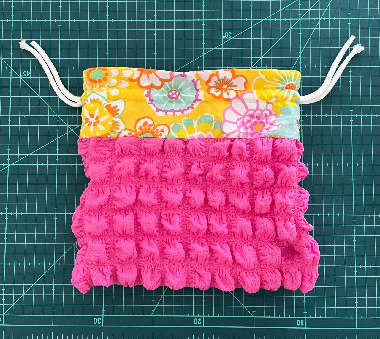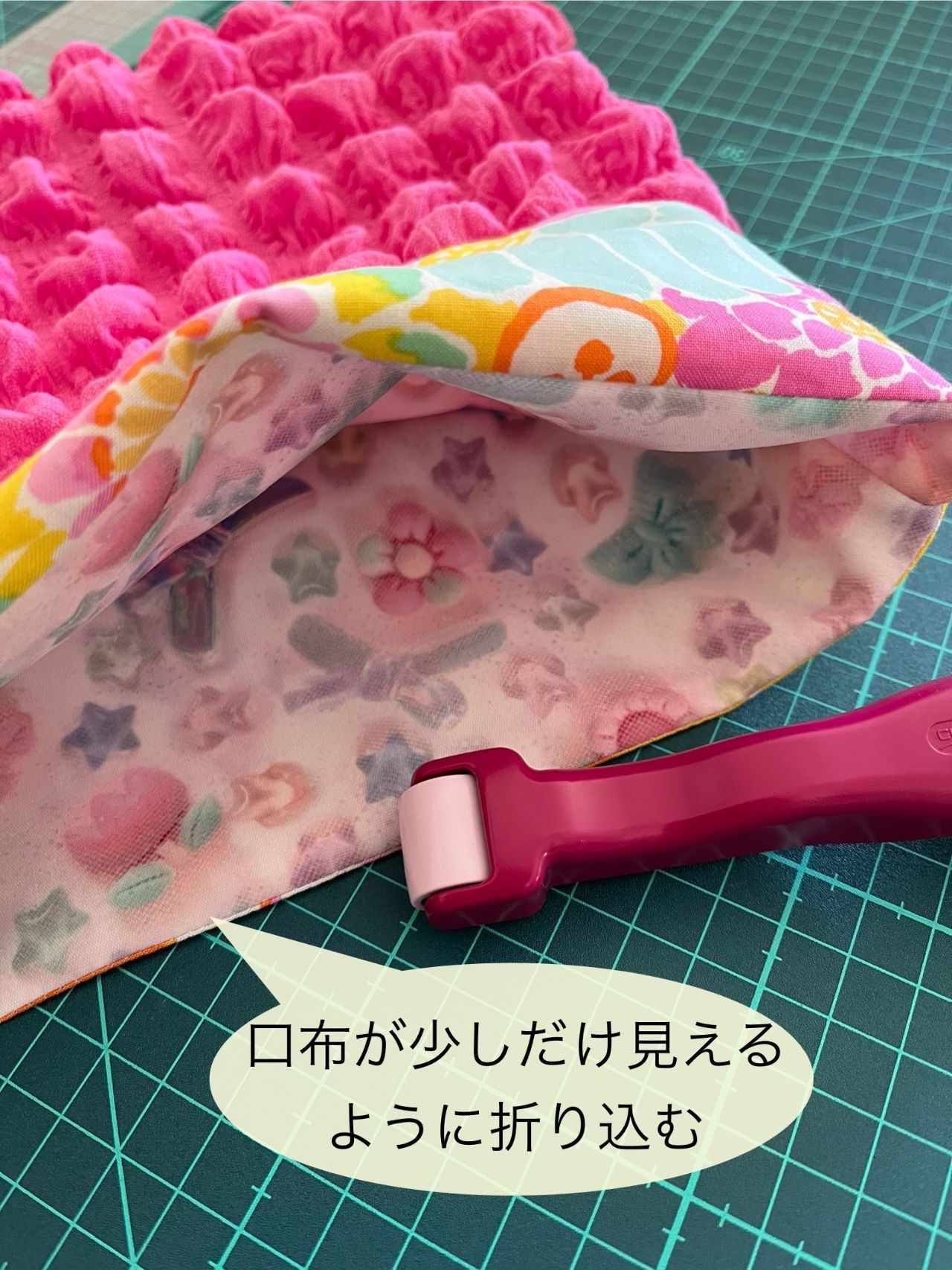 ワッフルと口布の縫い合せ線、裏布と口布の縫い合せ線が揃うように重ねて紐の通し口を口布の両脇にそれぞれ1.5cm開けて縫代1cmで縫う返し口を裏布の片側に10cm程残し縫う