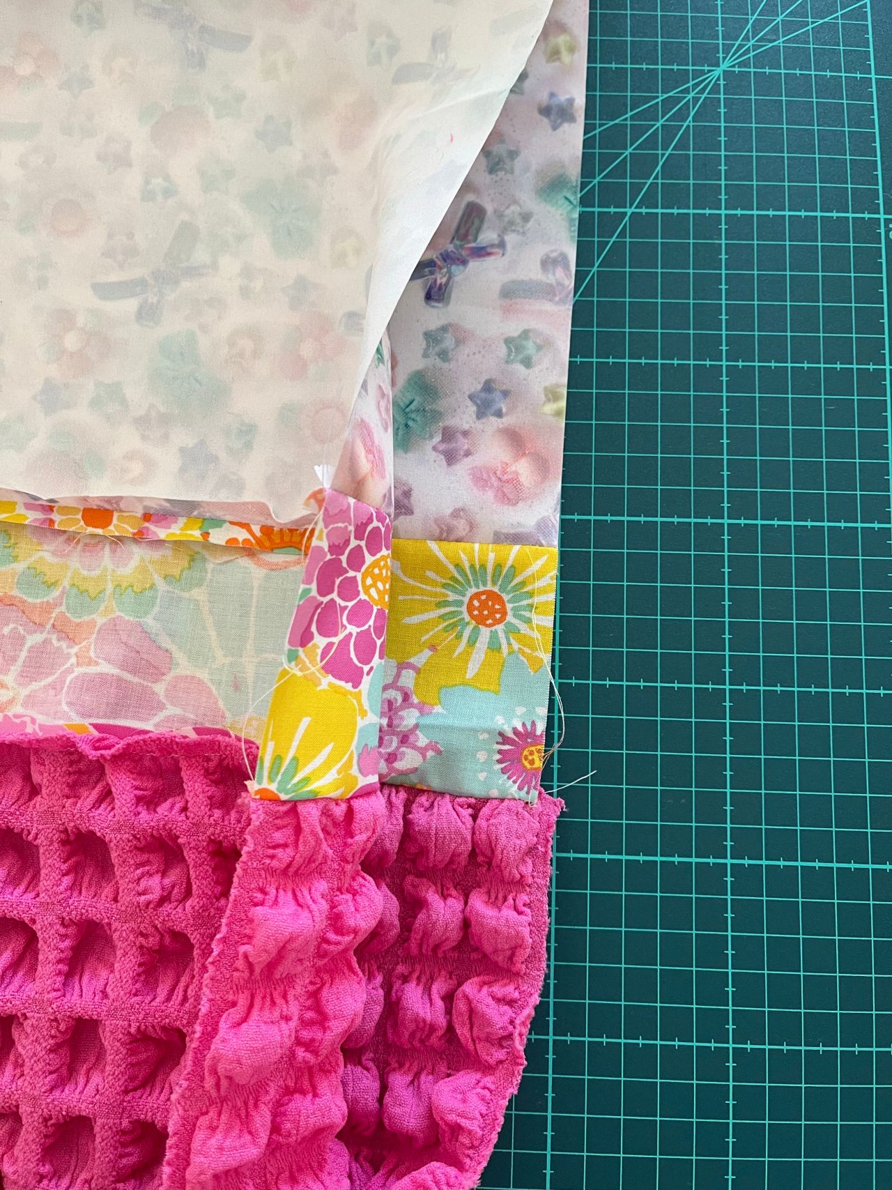 この時ワッフル生地と口布用カットクロスをクリップや待ち針で固定しワッフル生地を下にしてステッチをかけます表布と裏布を中表に重ね縫代1cmで縫う