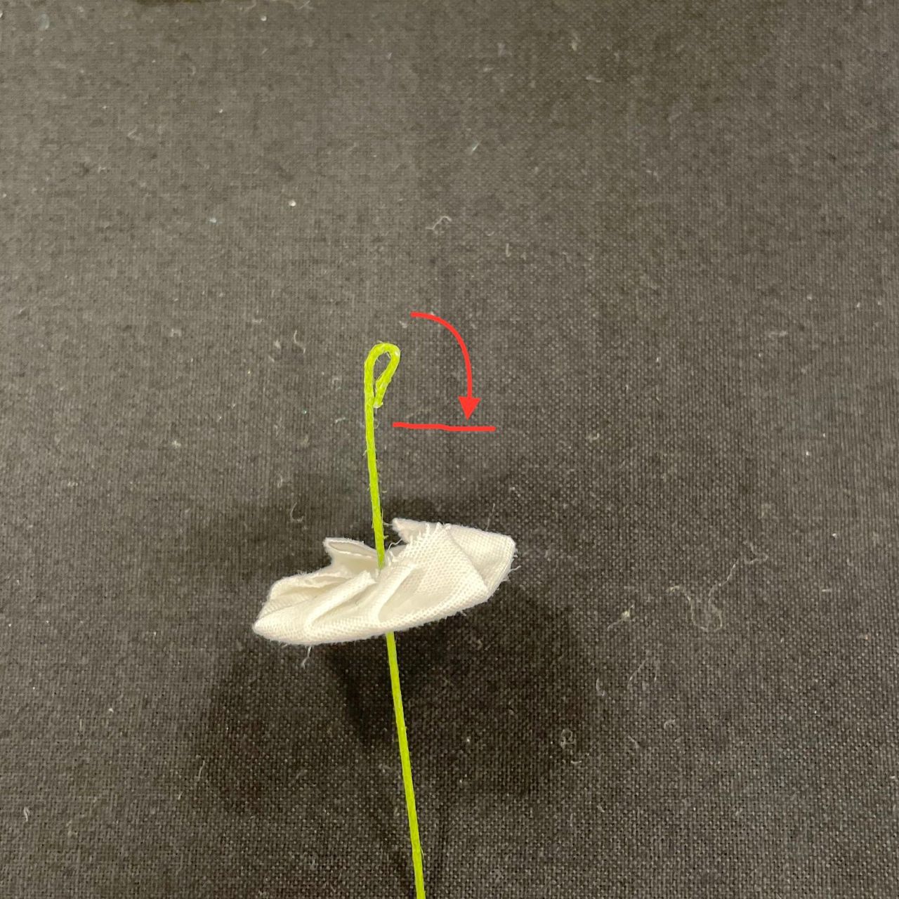 パールビーズを6個テグスに通して結びます生地が準備できたらつまみ細工プレートに挟んで順番に縫っていくだけです!