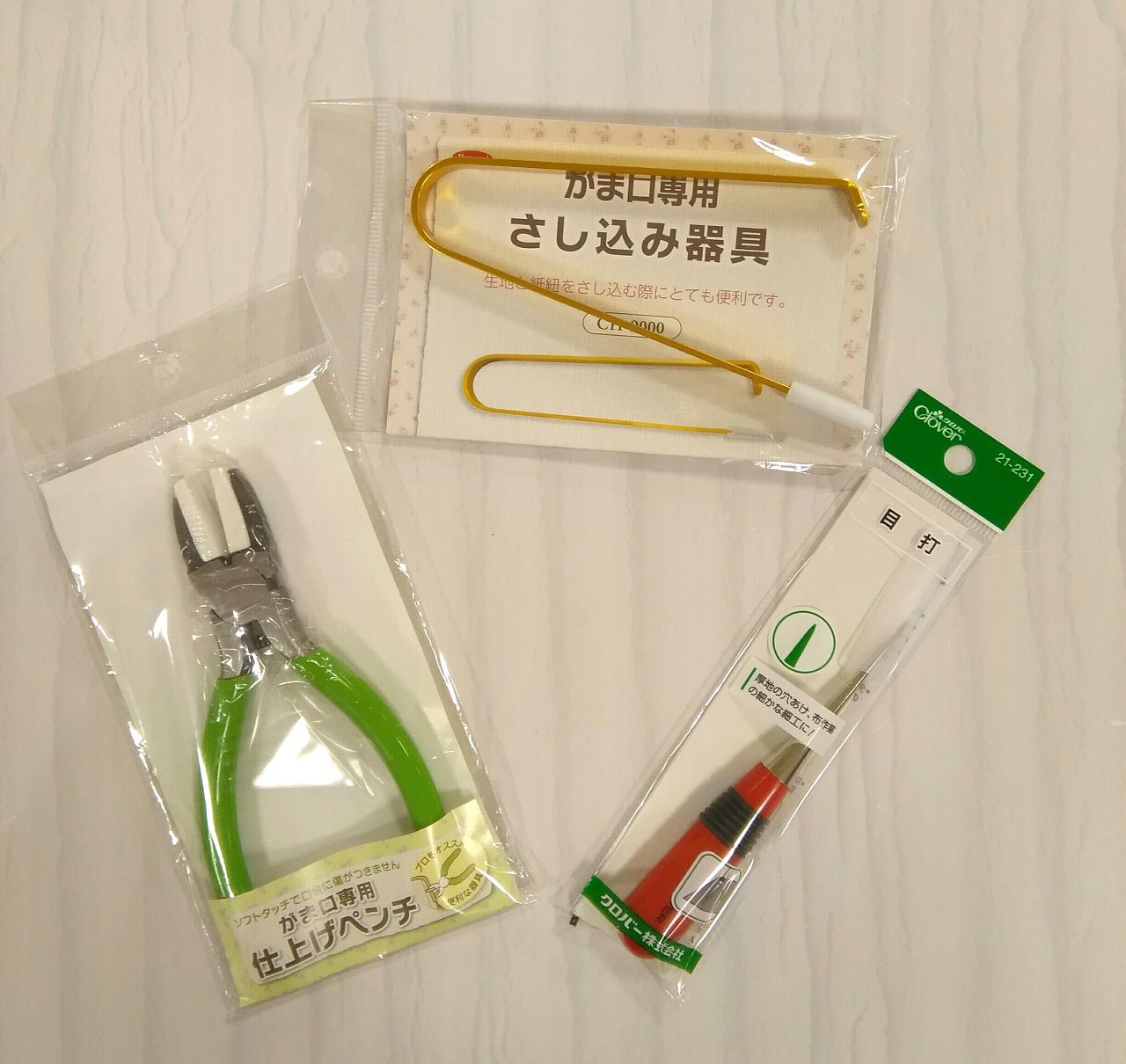 ◎(左)がま口用ペンチ →がま口の金属部分に傷がつきにくいペンチ。幅広なので楽チンです。(¥1500+税)