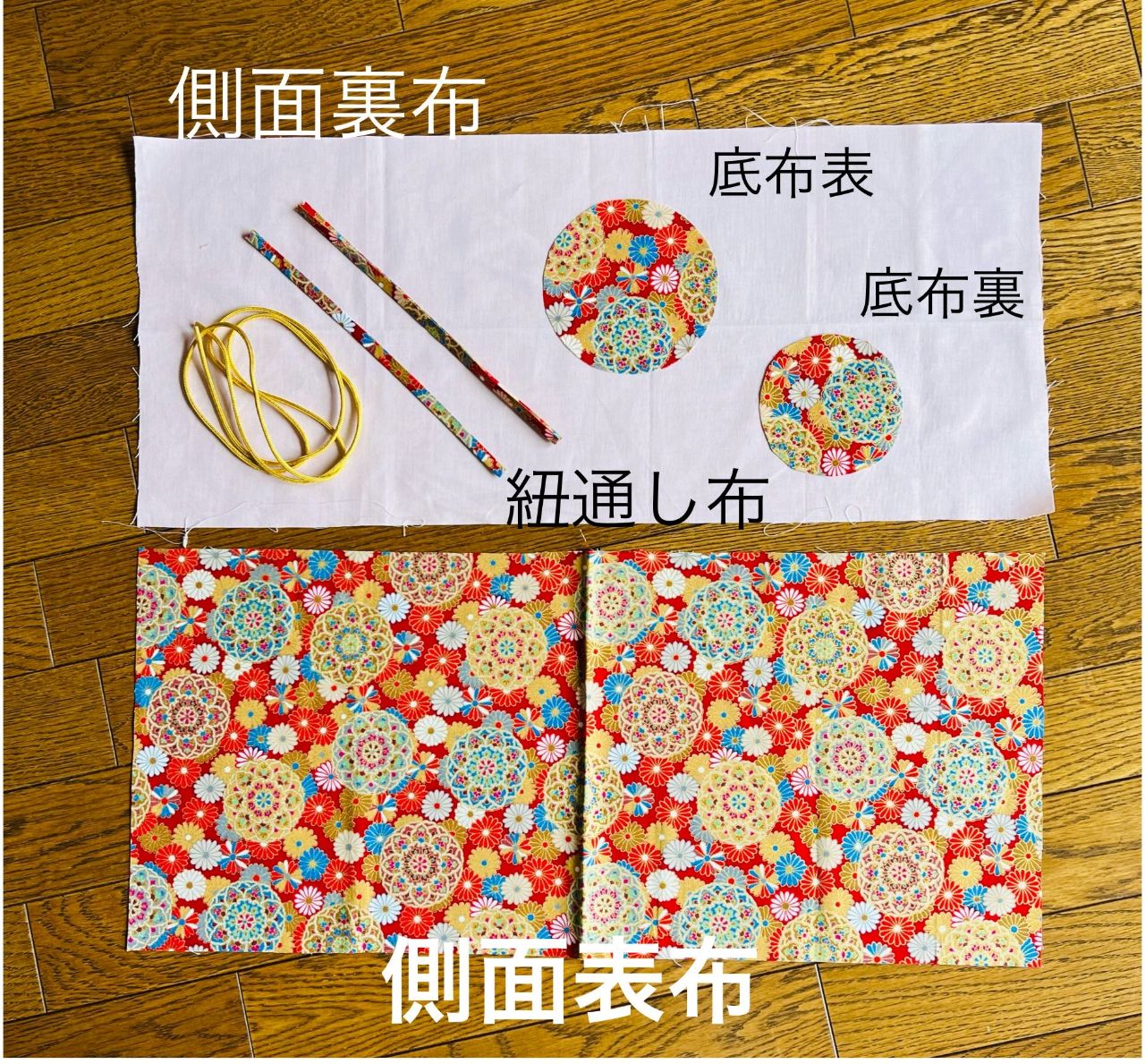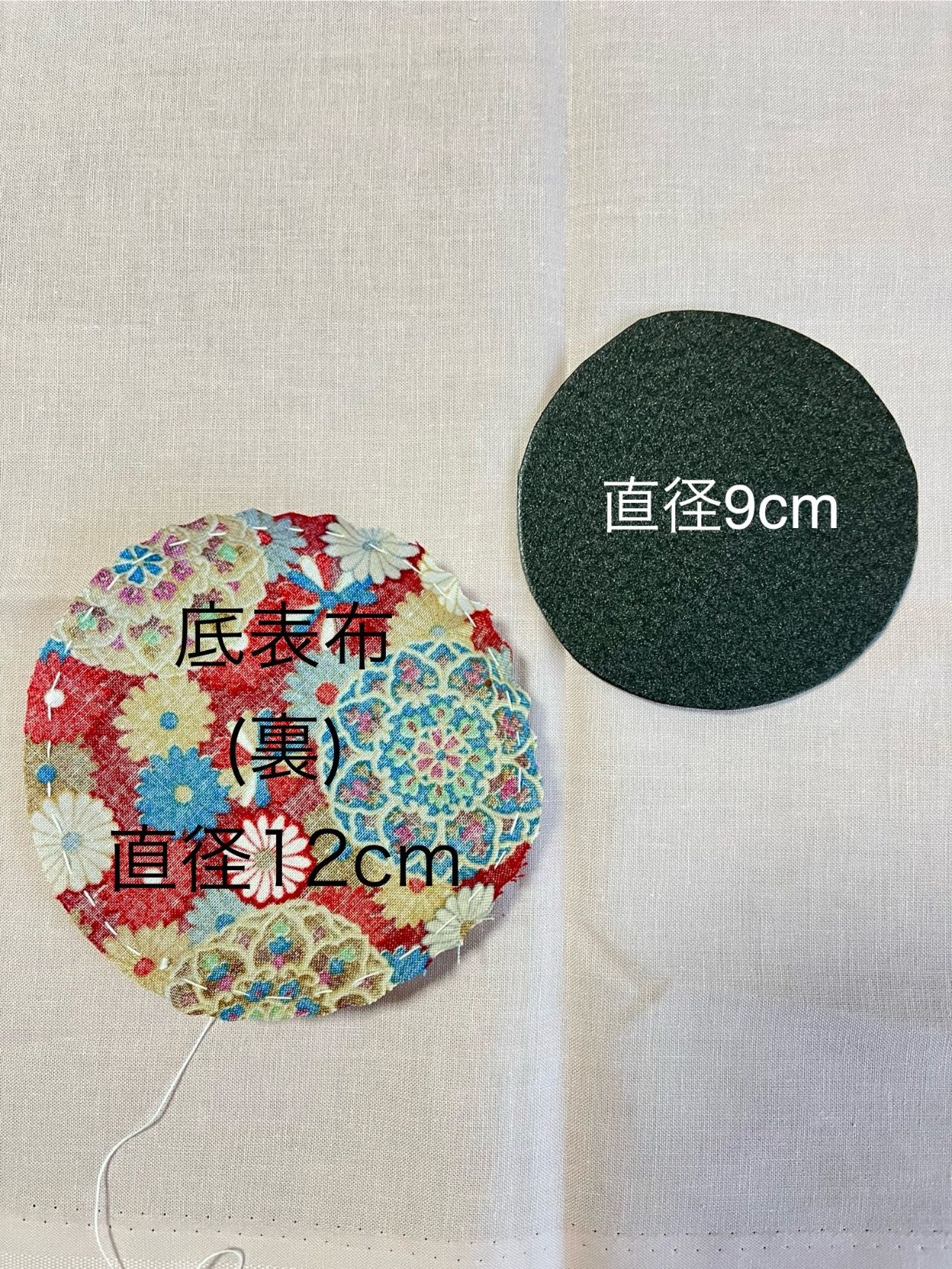 紐通し用布は24cm×3cmを2本、底布は直径12cmと10cmに1枚づつ裁断する(全て縫代込み)