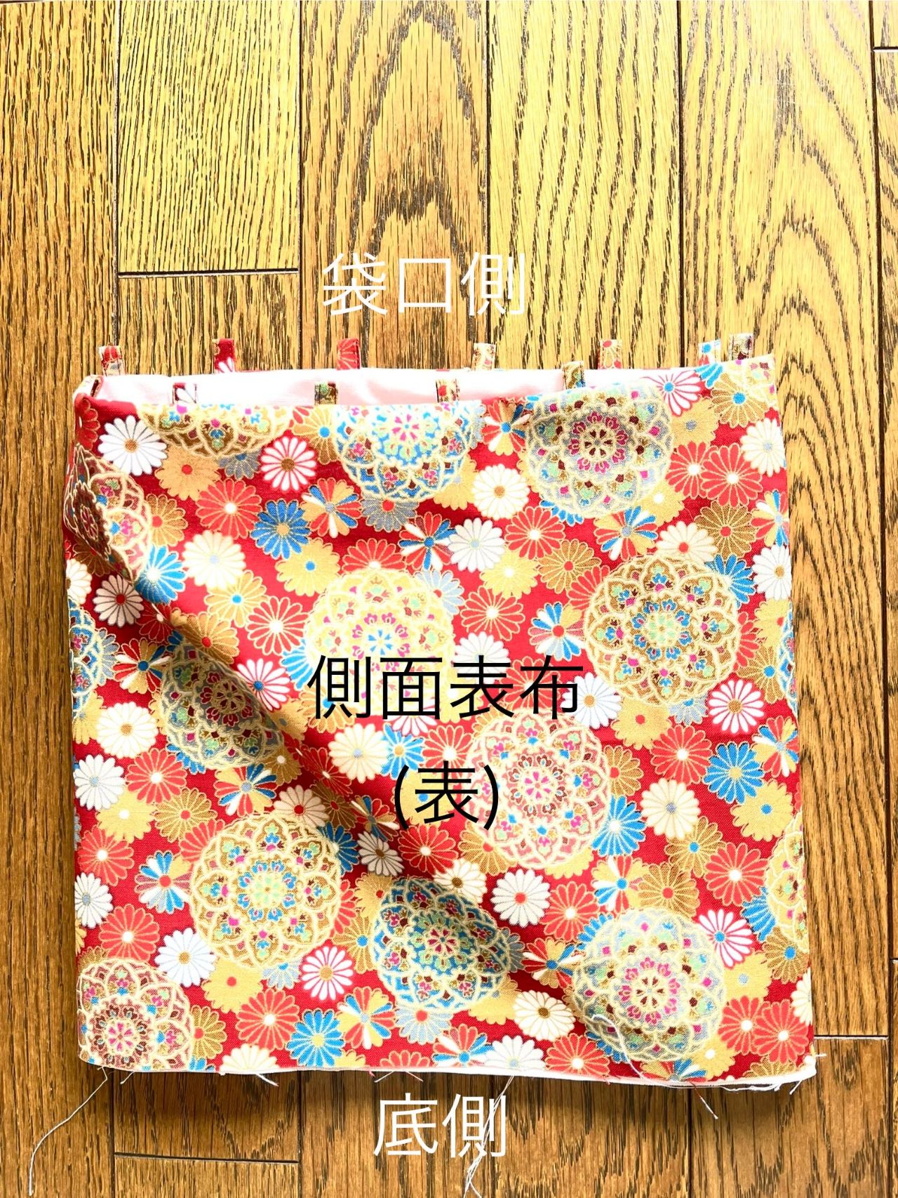 ③側面表布の表側、袋口に紐通し布を半分に折って