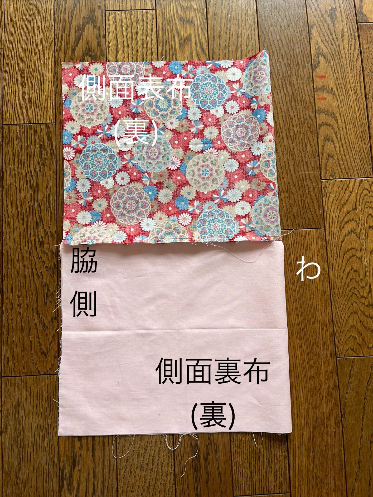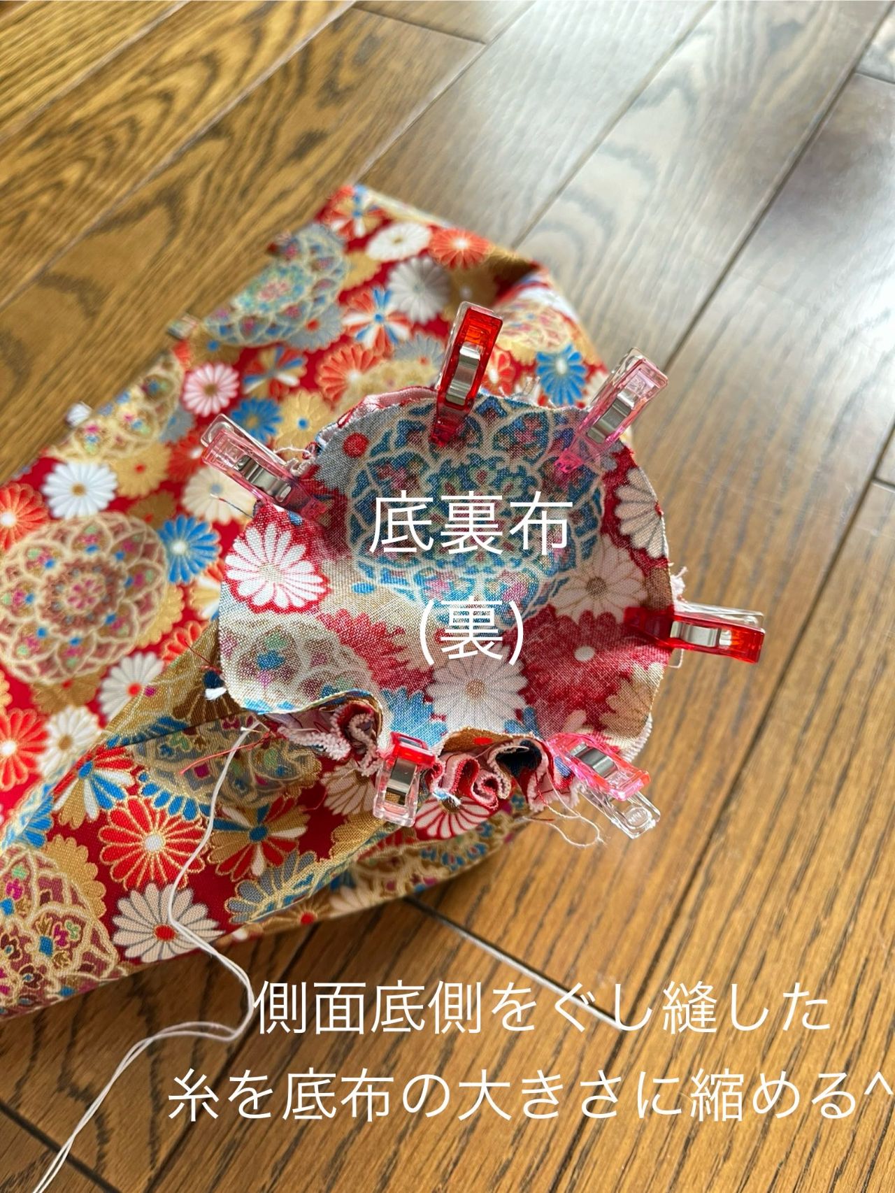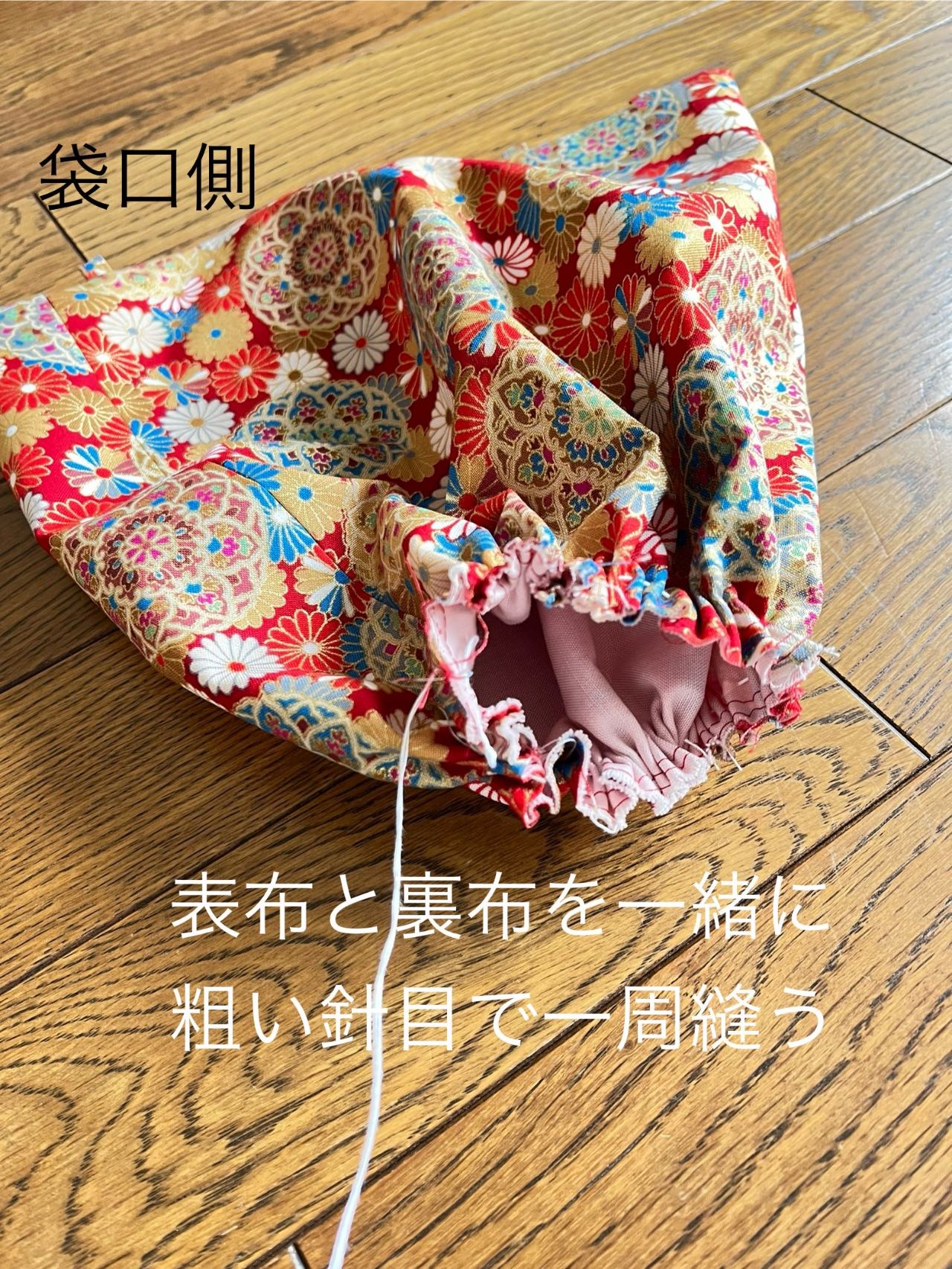 ⑦側面布の底側を表、裏布を一緒に縫い代1.2cmでぐし縫、又は粗い針目で縫う