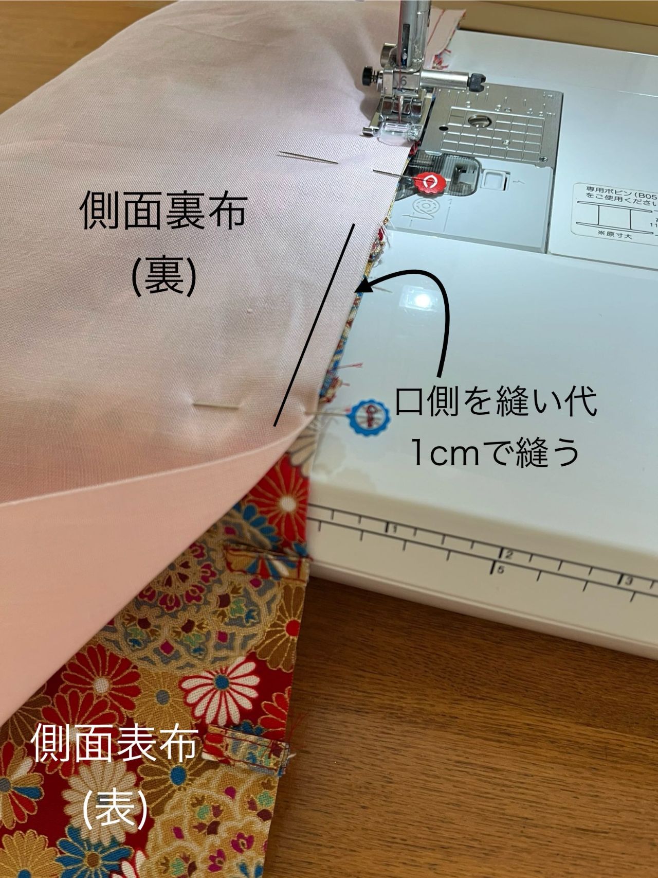 ④側面布を中表にし袋口側を縫い代1cmで縫う