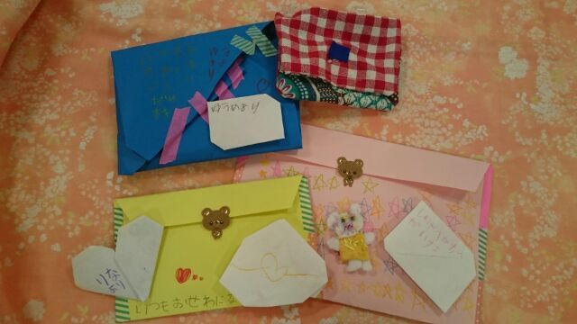先日、手づくり衣装を見せに来てくれた、女の子なかよし4人組が、お手紙や手づくりの小物を届けに来てくれました。