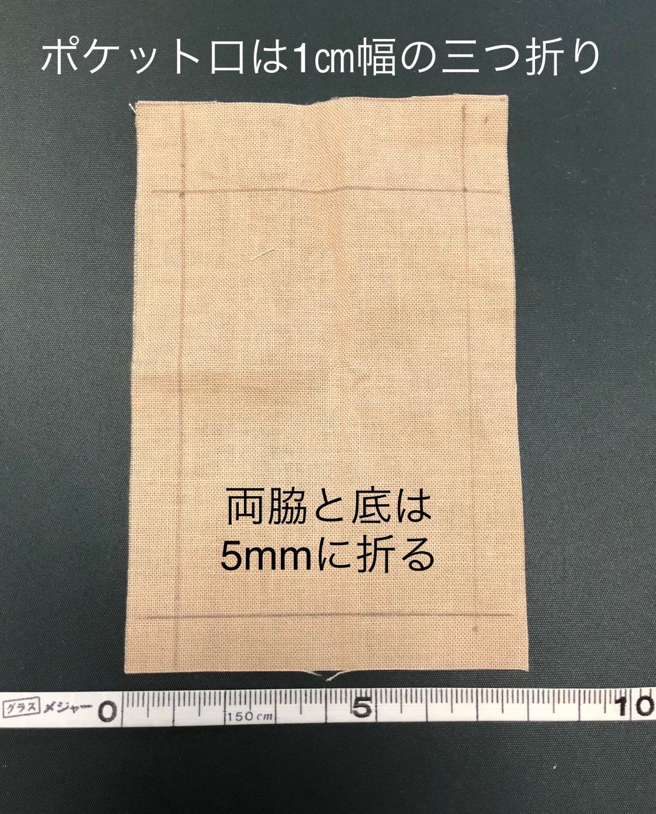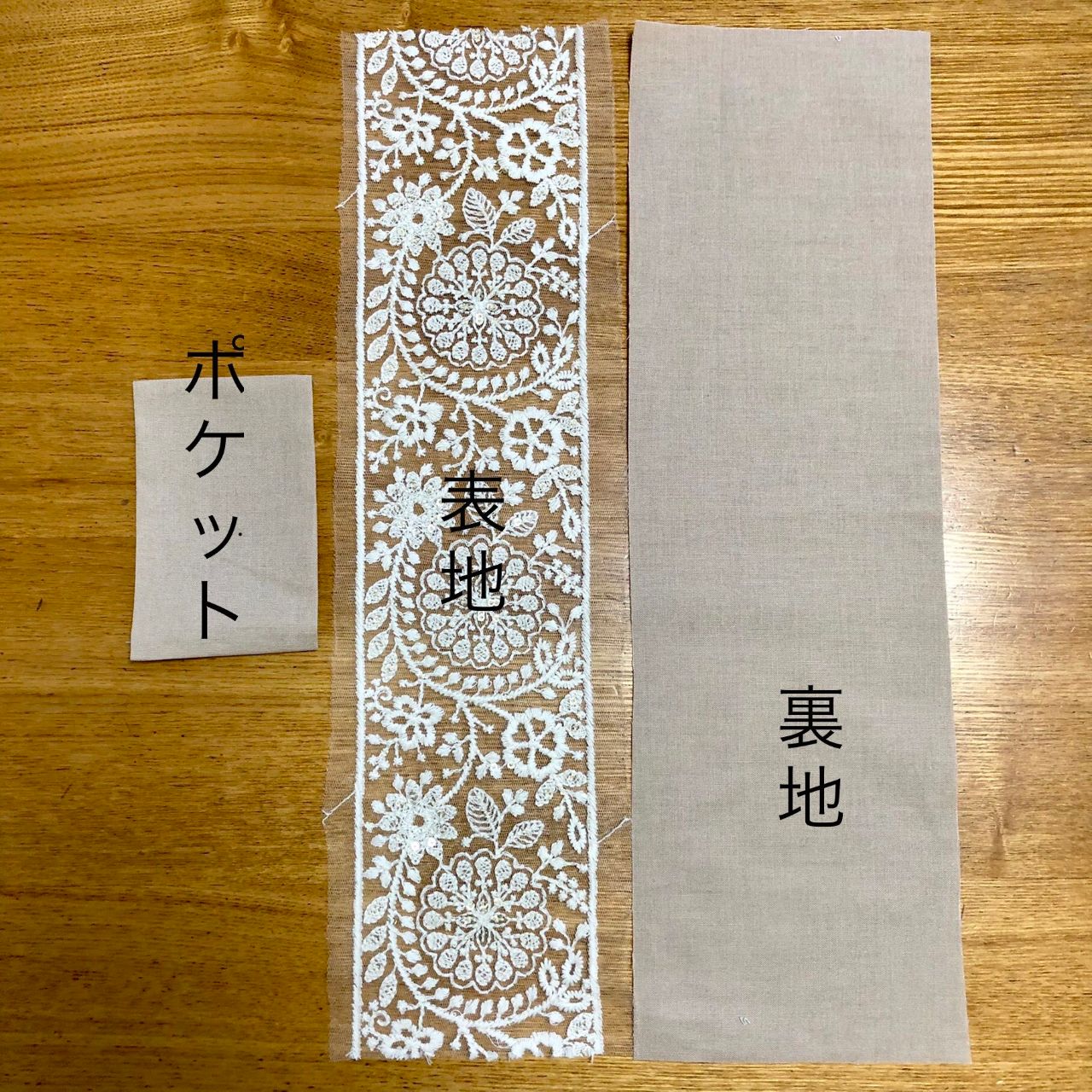 シーチングは裏地用ヨコ11㎝×39㎝1枚とポケット用8㎝×12㎝1枚