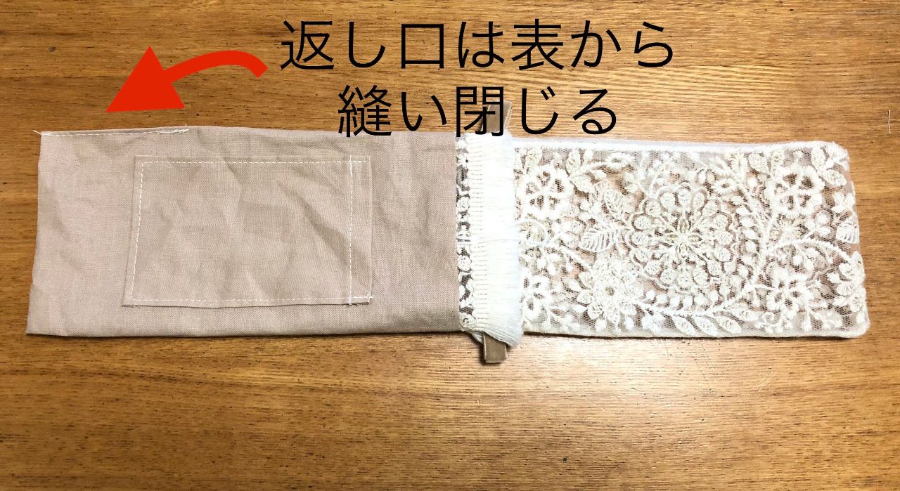 中表のまま、縫い合わせ部分が中央にくるよう半分に畳み、裏地側に返し口7〜8㎝残し両脇を縫い代1㎝で縫う