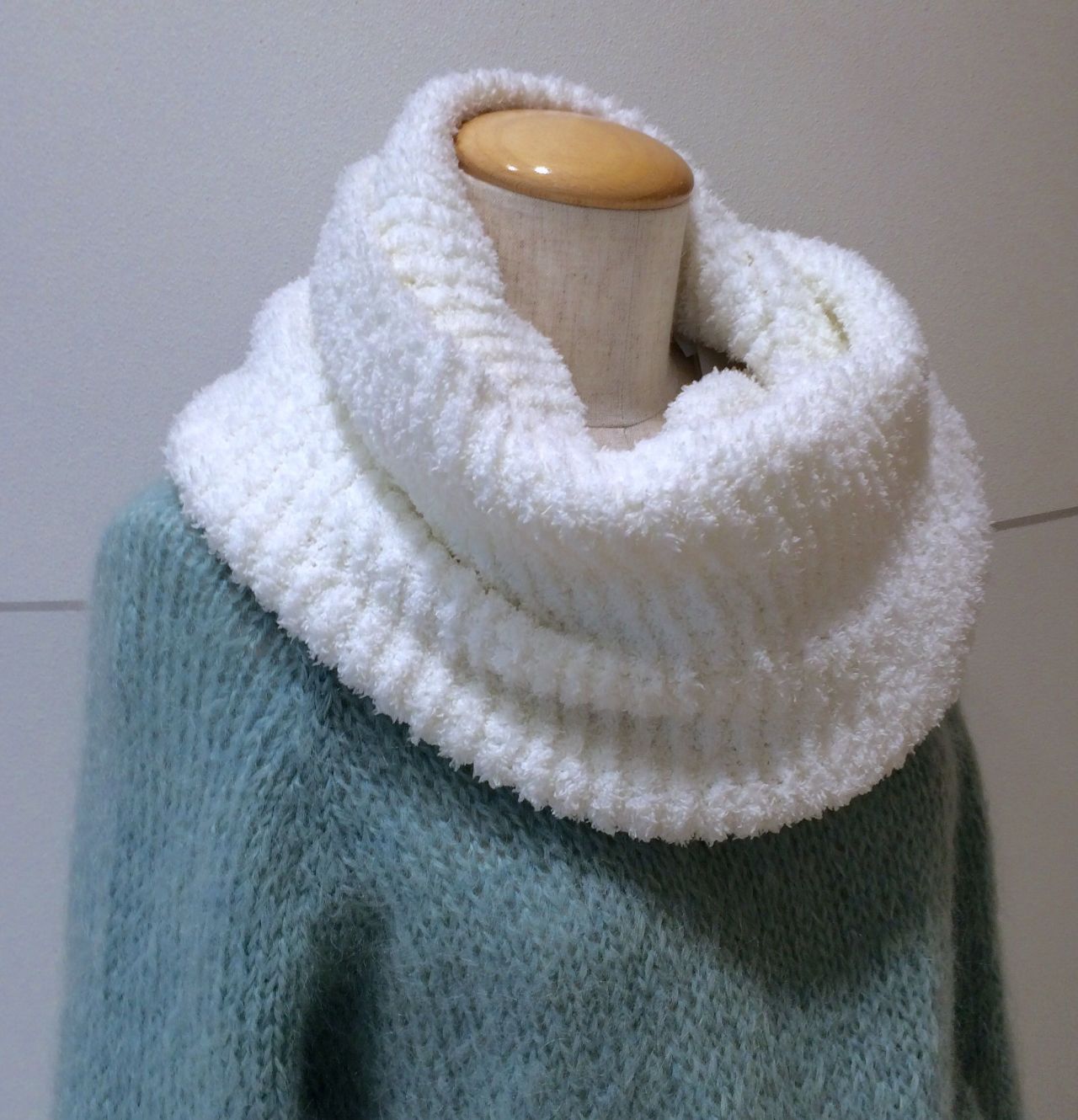 写真のスヌードの編み図つきキットもご用意しています