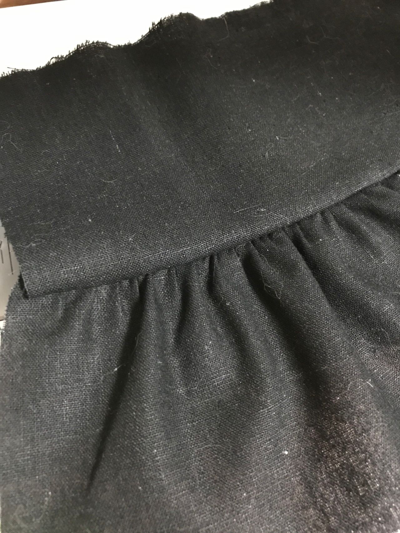 ギャザーを寄せたくない方の布を押さえの隙間に挟みます