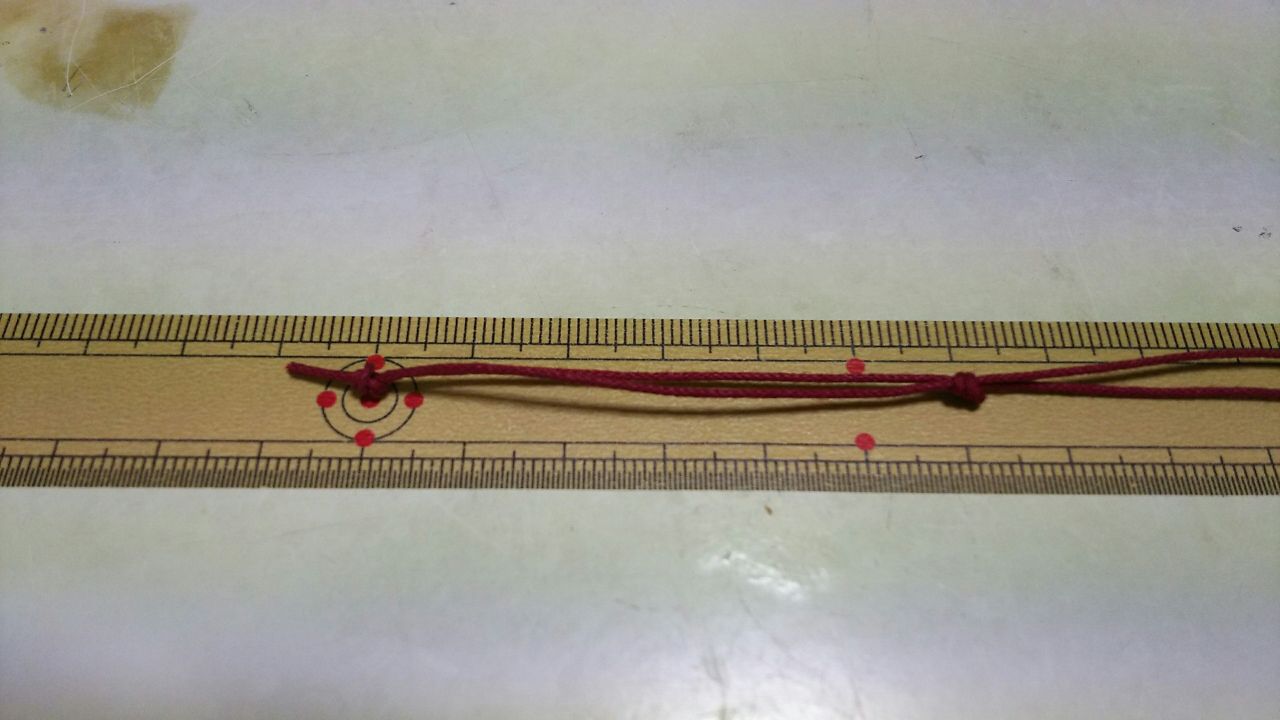 45cmと55cmのコードを揃えて端から1cmを結び、さらに結び目から6cmにも結び目を作ります